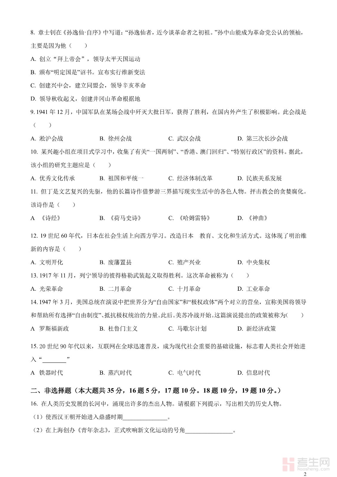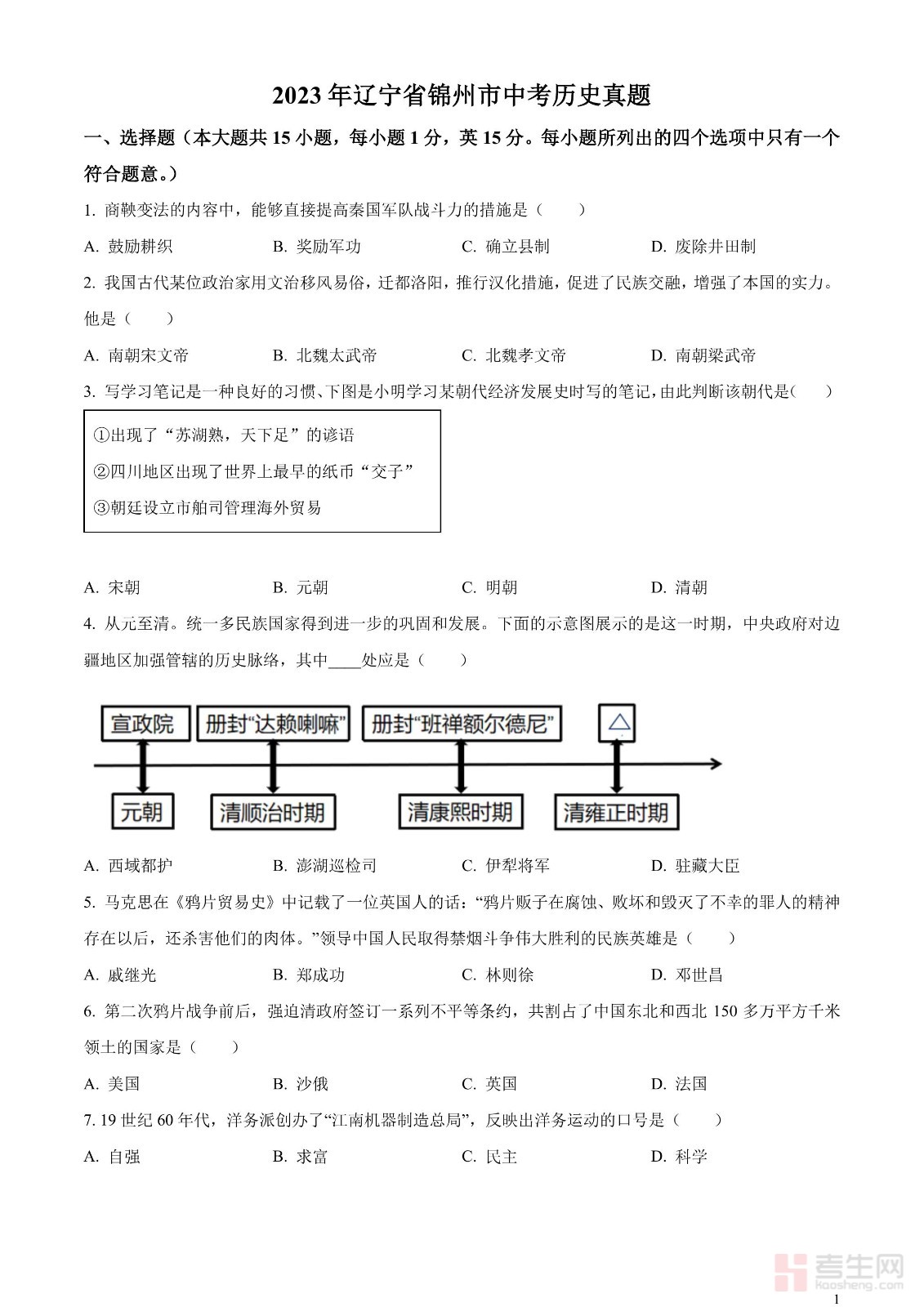 2023年辽宁省锦州市中考历史真题(原卷版)