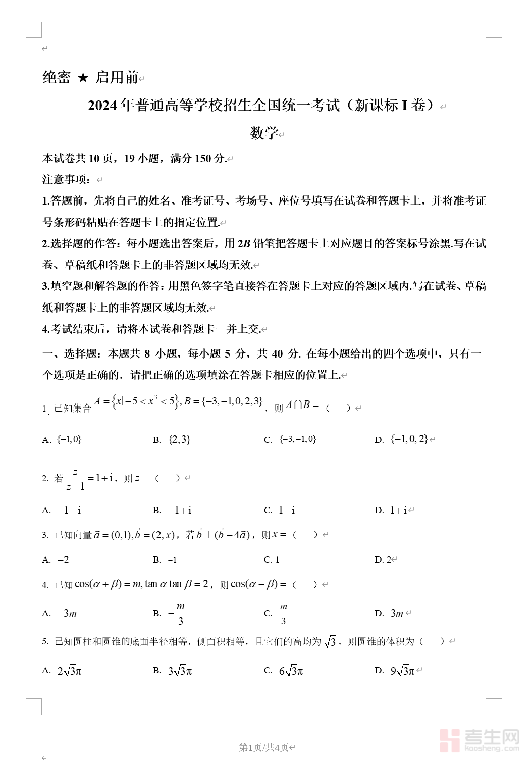 2024年新课标Ⅰ卷数学卷高考真题文字版