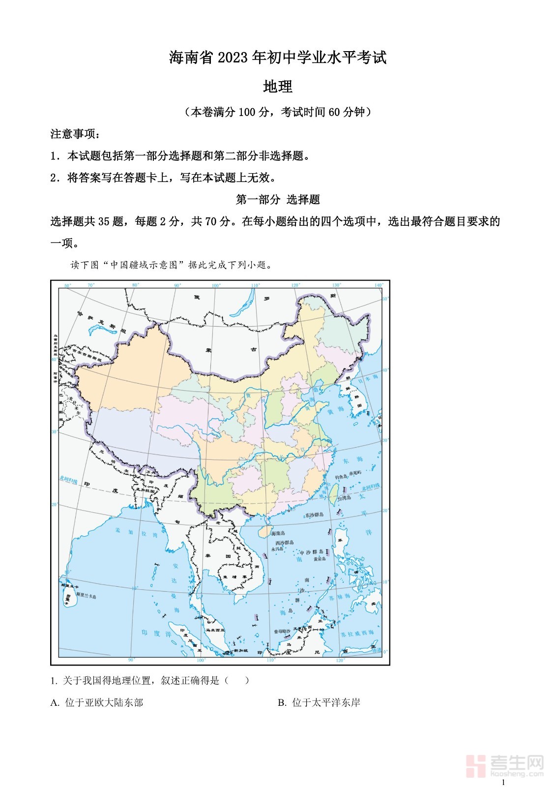 2023年海南省中考地理真题(原卷版)