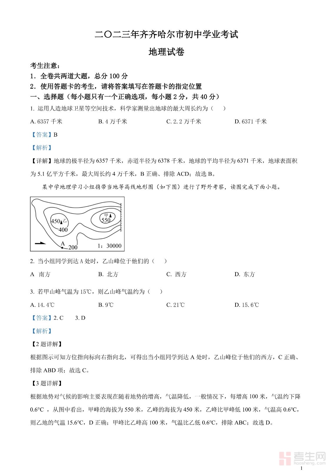 2023年黑龙江省齐齐哈尔市中考地理真题(解析版)