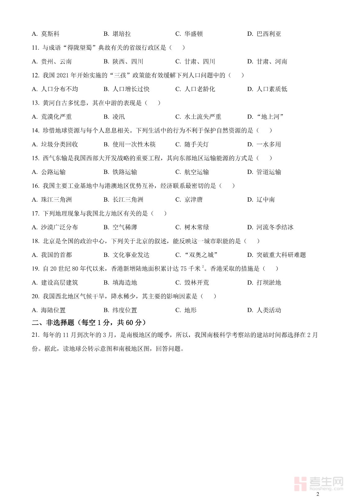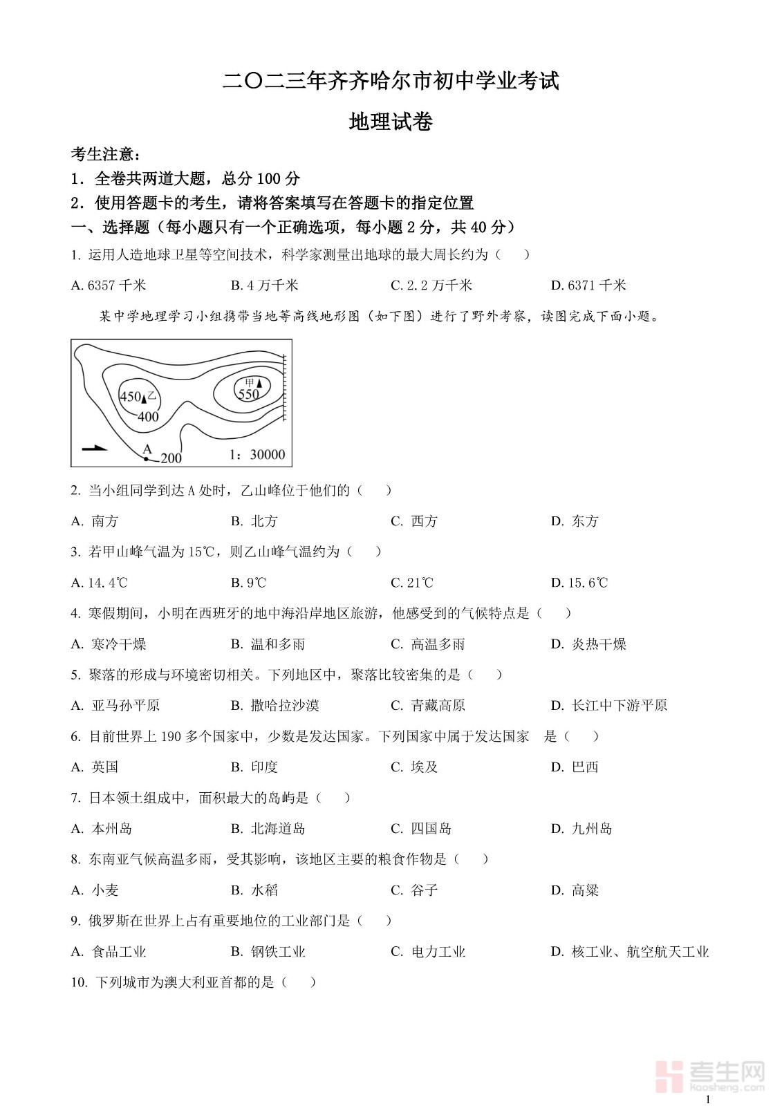 2023年黑龙江省齐齐哈尔市中考地理真题(原卷版)