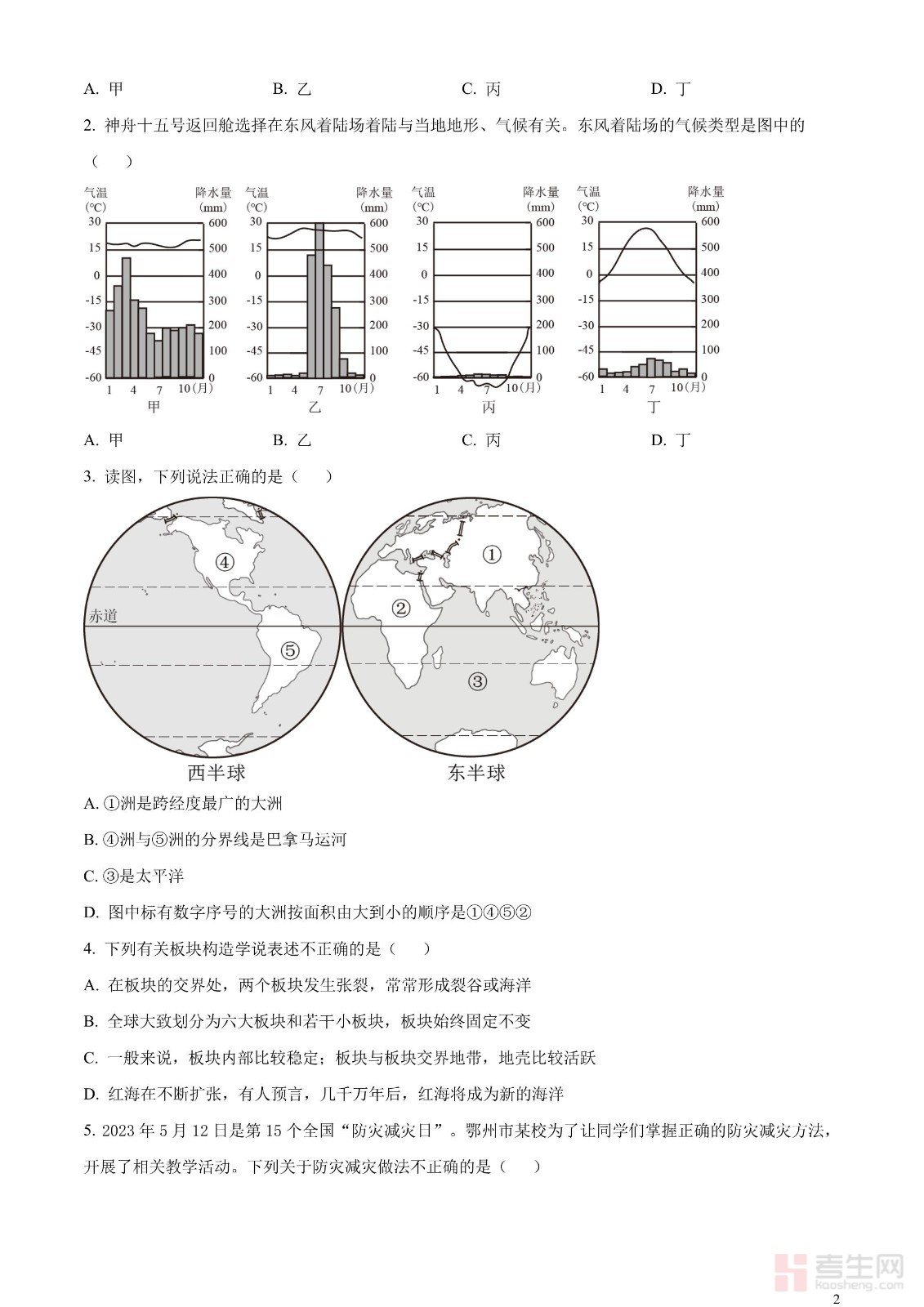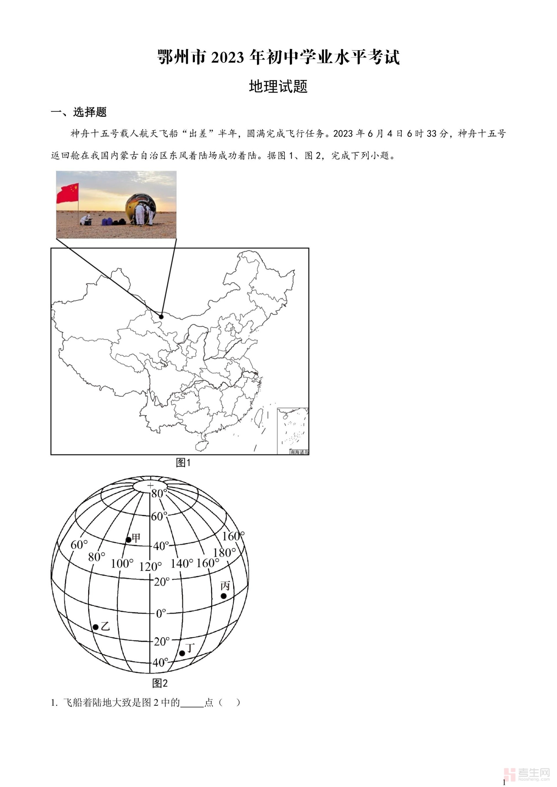 2023年湖北省鄂州市中考地理真题(原卷版)
