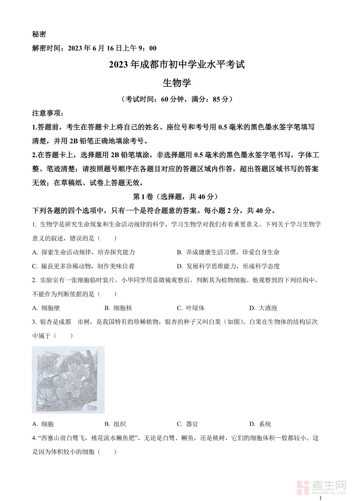 2023年中考生物真题