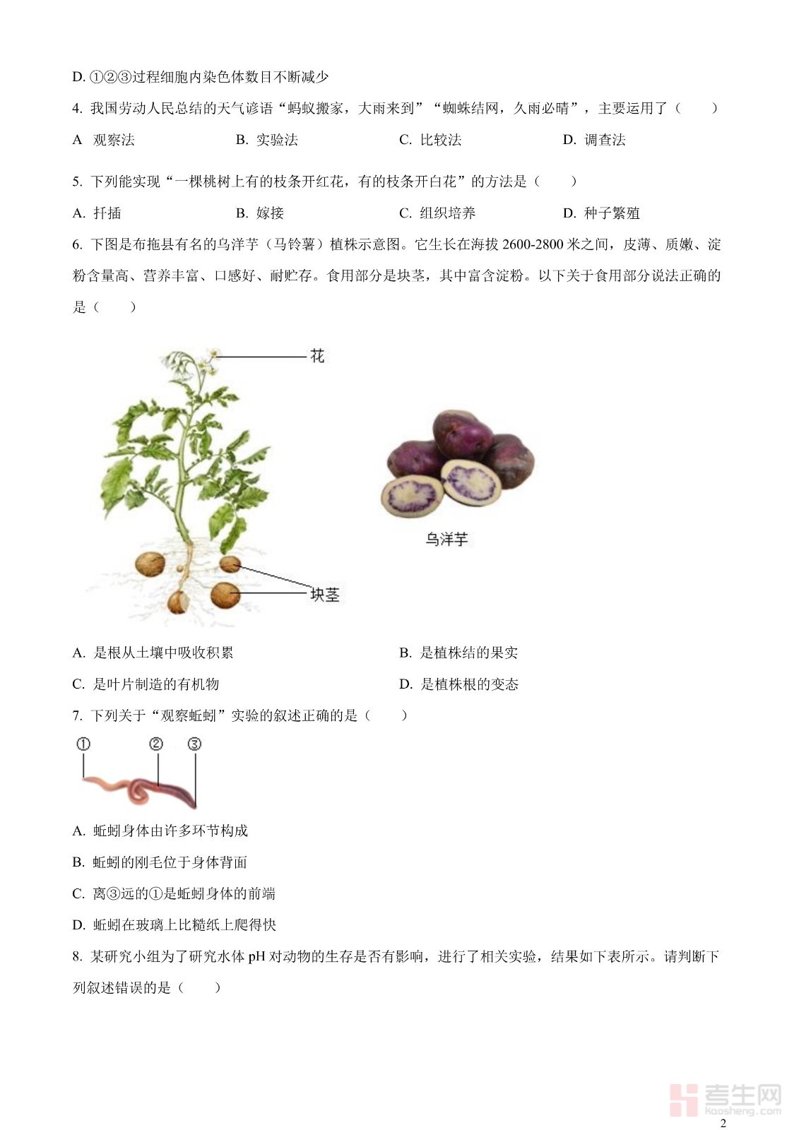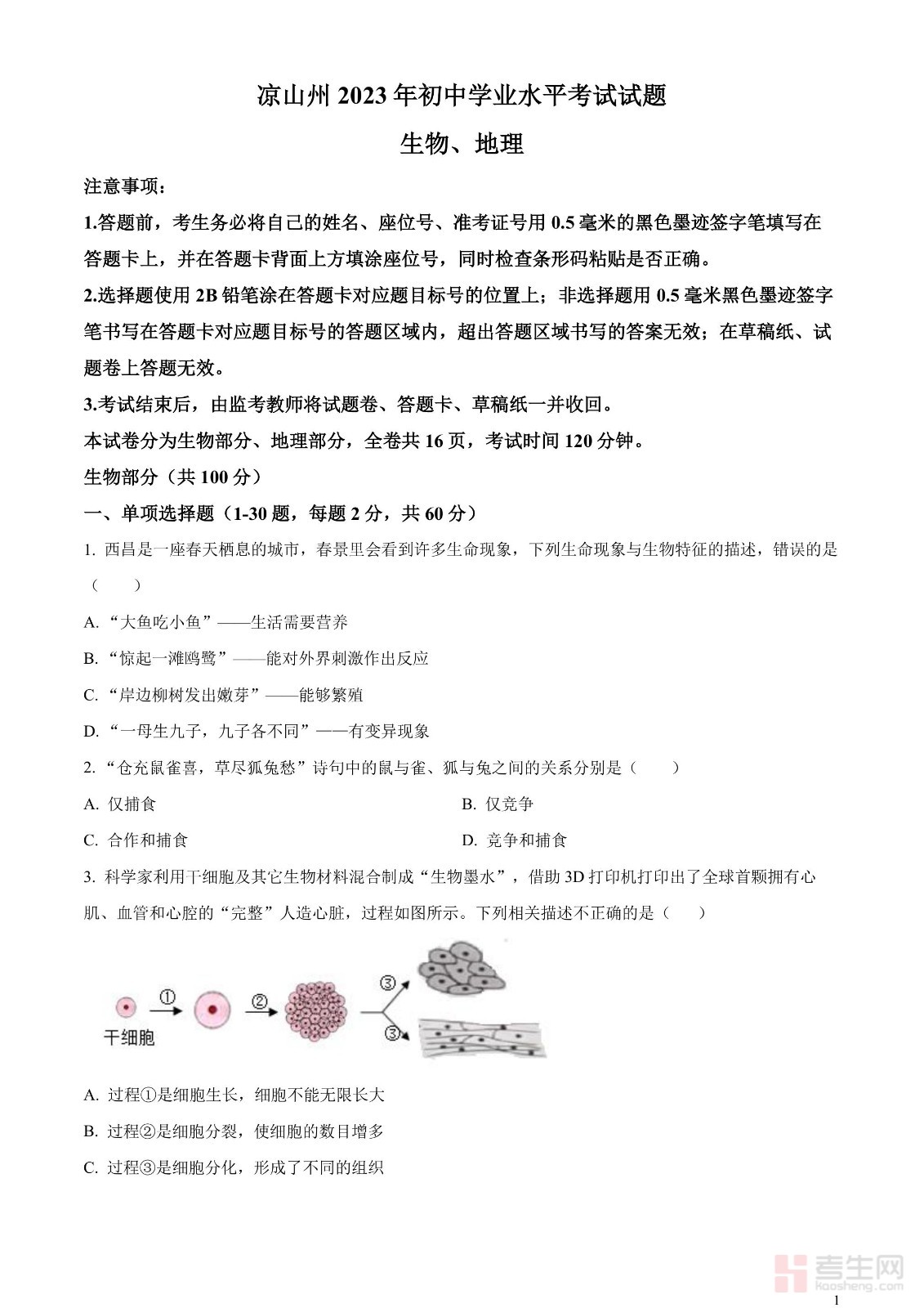 2023年四川省凉山彝族自治州中考生物真题(原卷版)