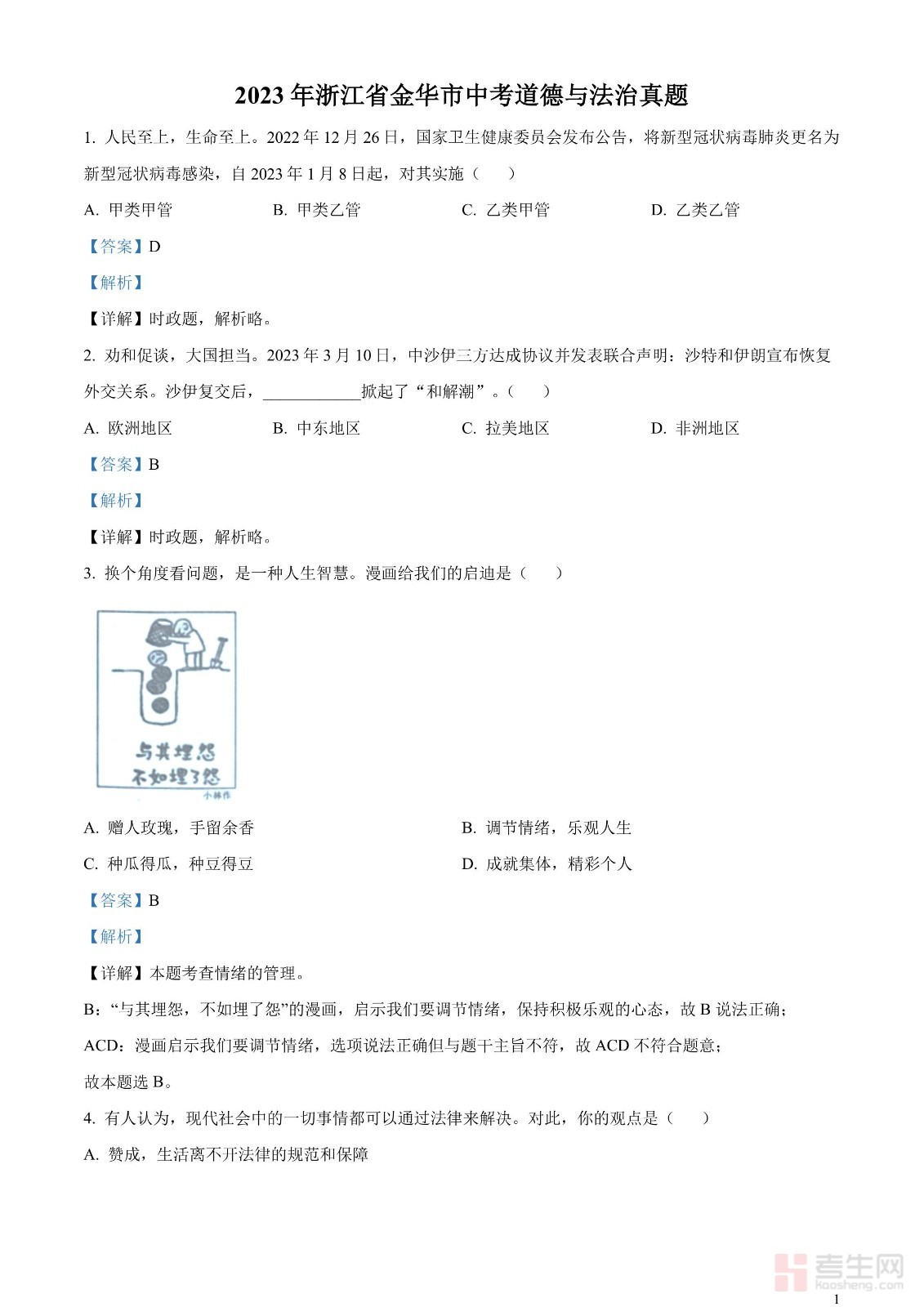 2023年浙江省金华市中考道德与法治真题(解析版)