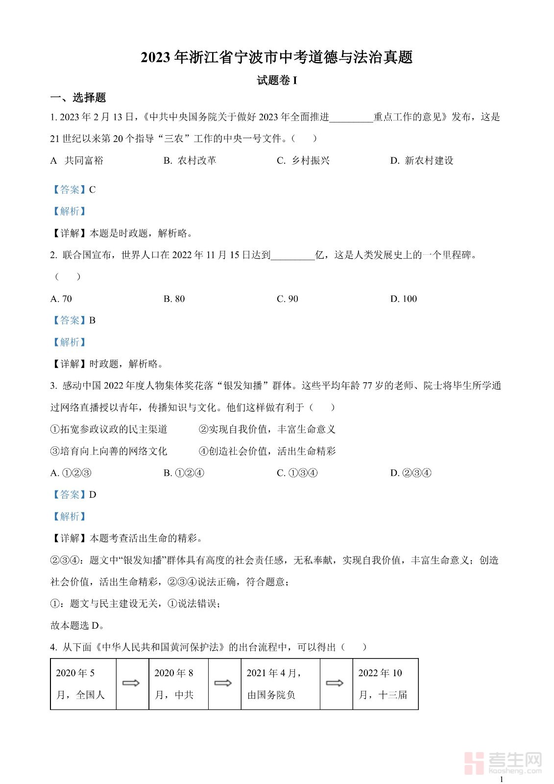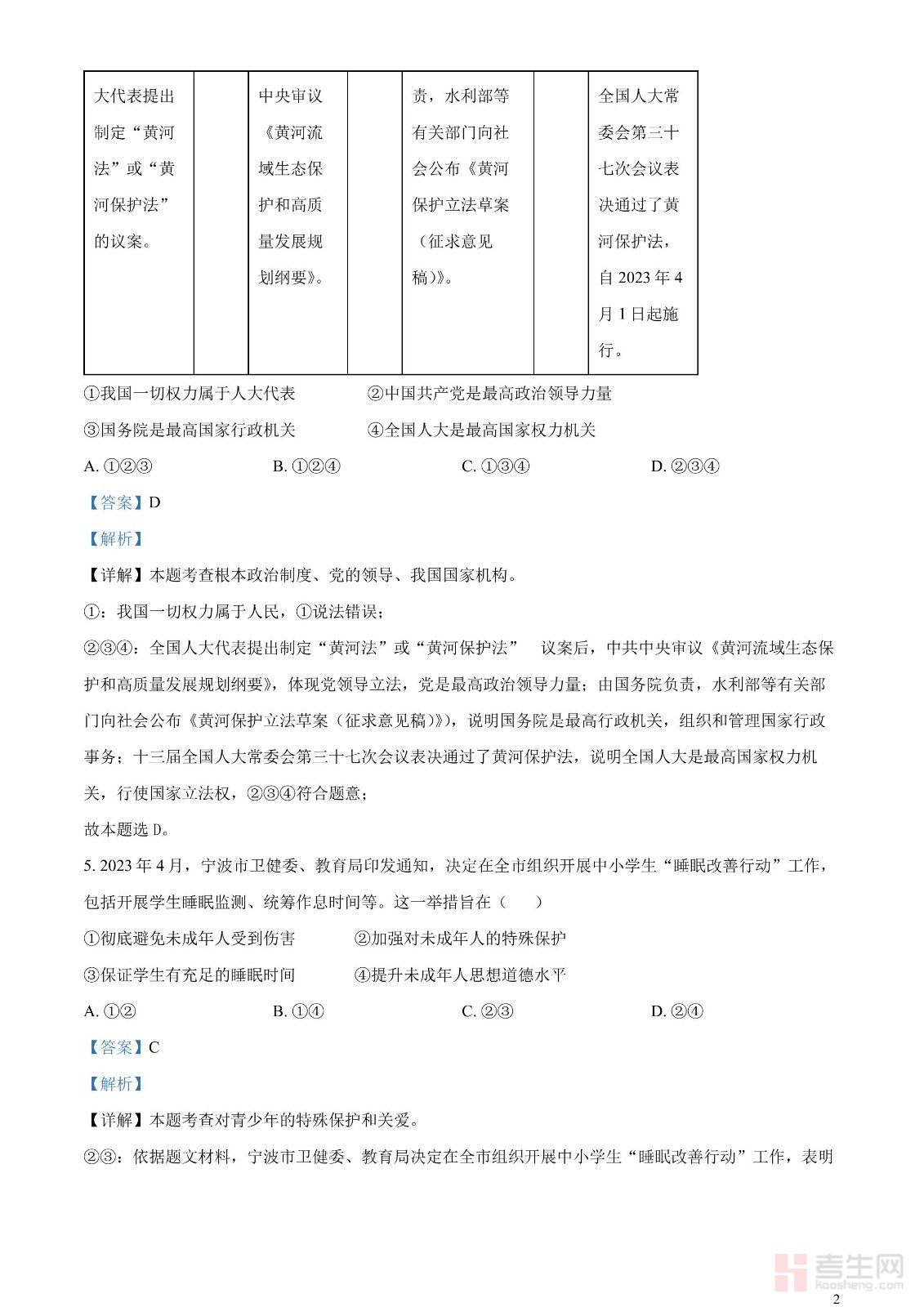 2023年浙江省宁波市中考道德与法治真题(解析版)