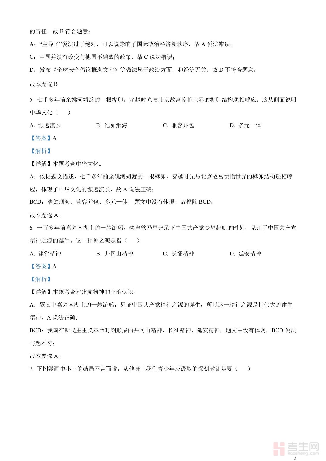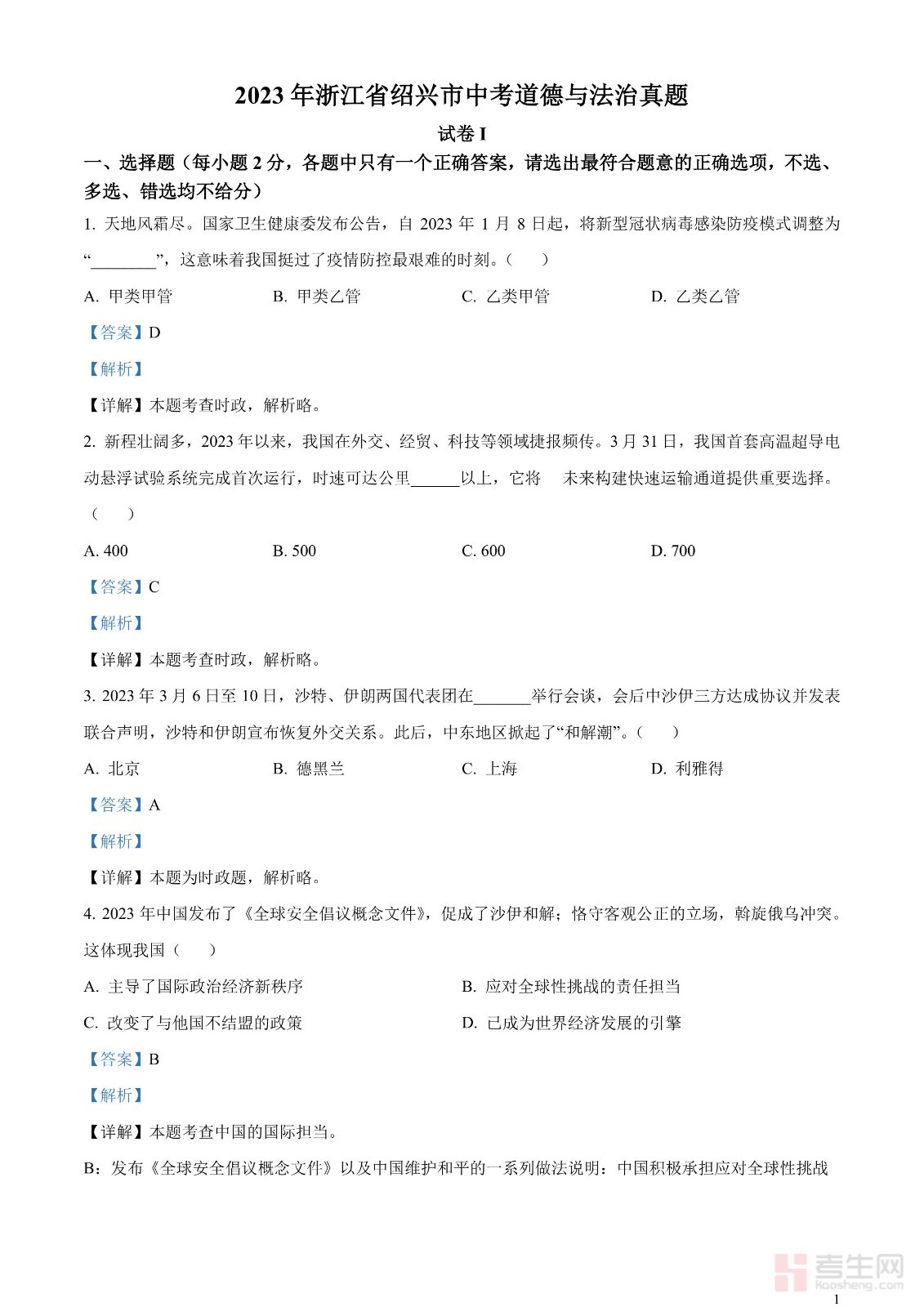 2023年浙江省绍兴市中考道德与法治真题(解析版)