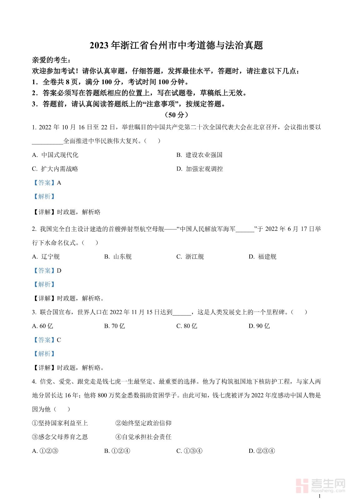 2023年浙江省台州市中考道德与法治真题(解析版)