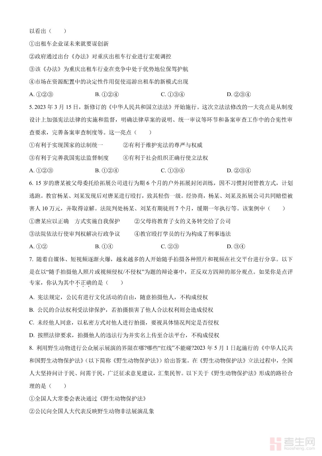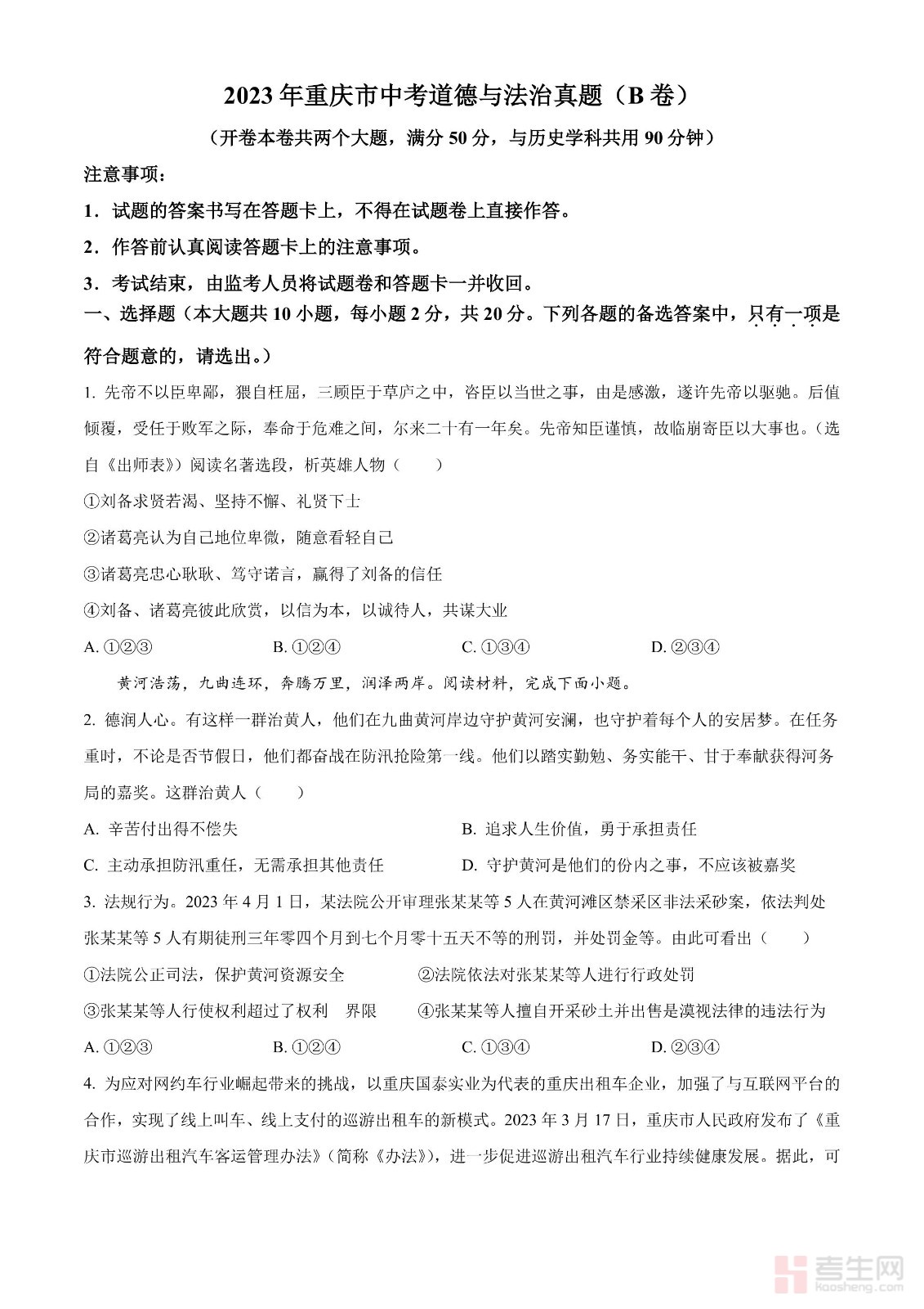 2023年重庆市中考道德与法治真题(B卷)(原卷版)