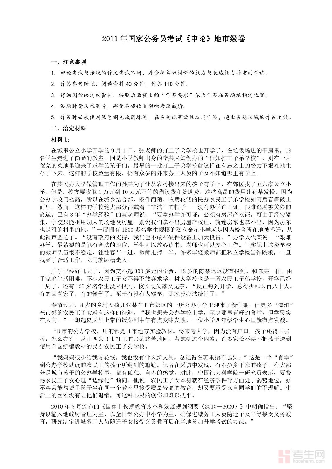 2011年国家录用公务员考试《申论》真题卷及答案(地市级)