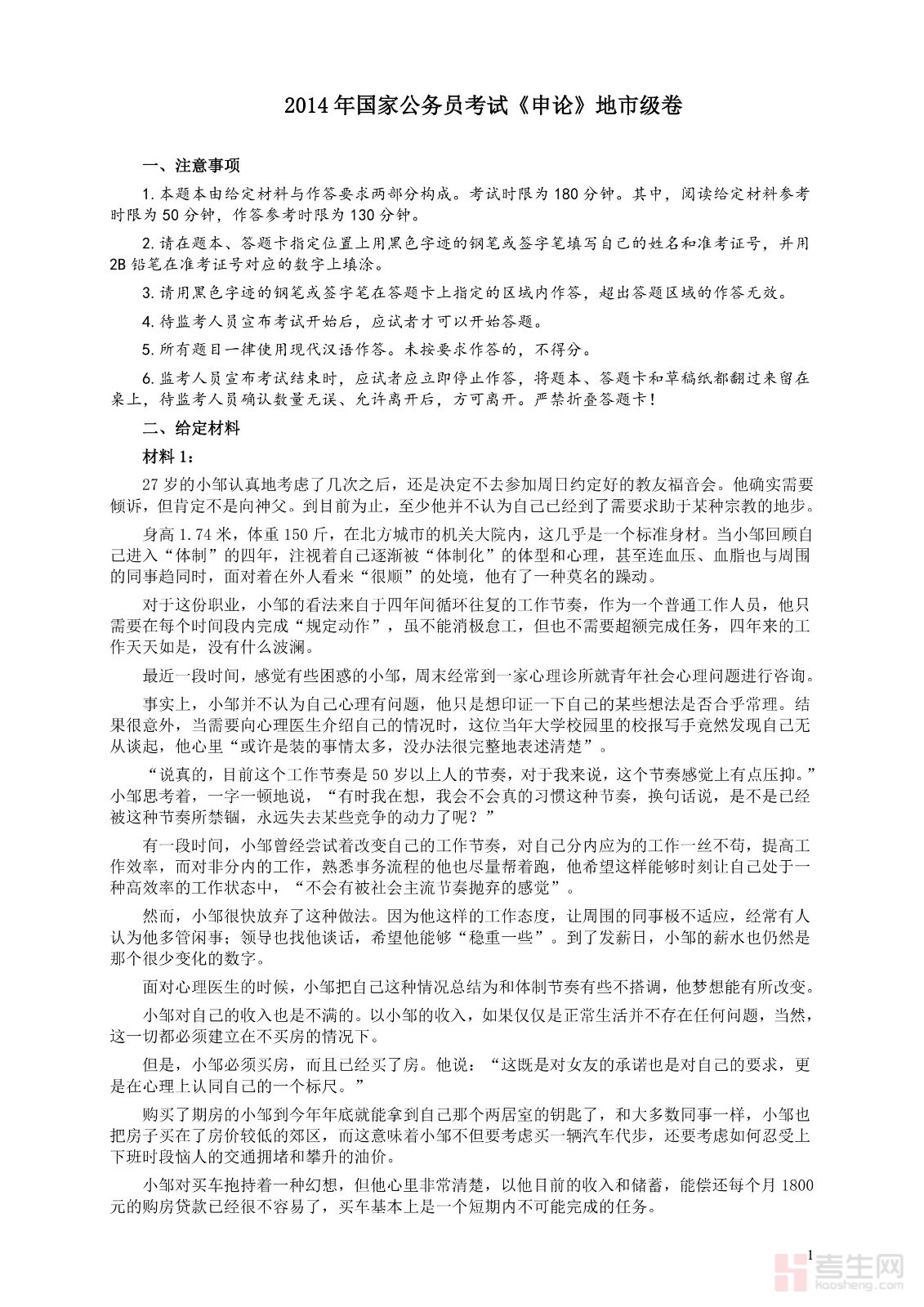 2014年国家录用公务员考试《申论》真题卷及答案(地市级)