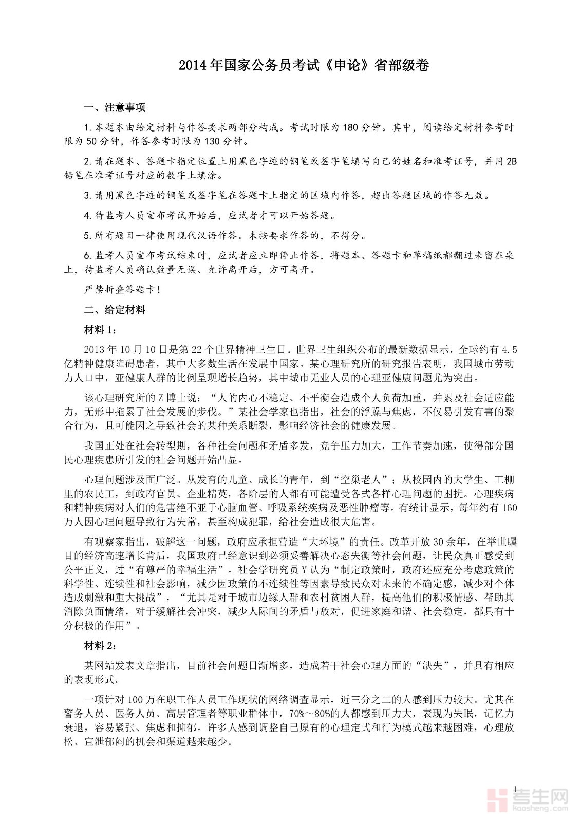 2014年国家录用公务员考试《申论》真题卷及答案(副省级)