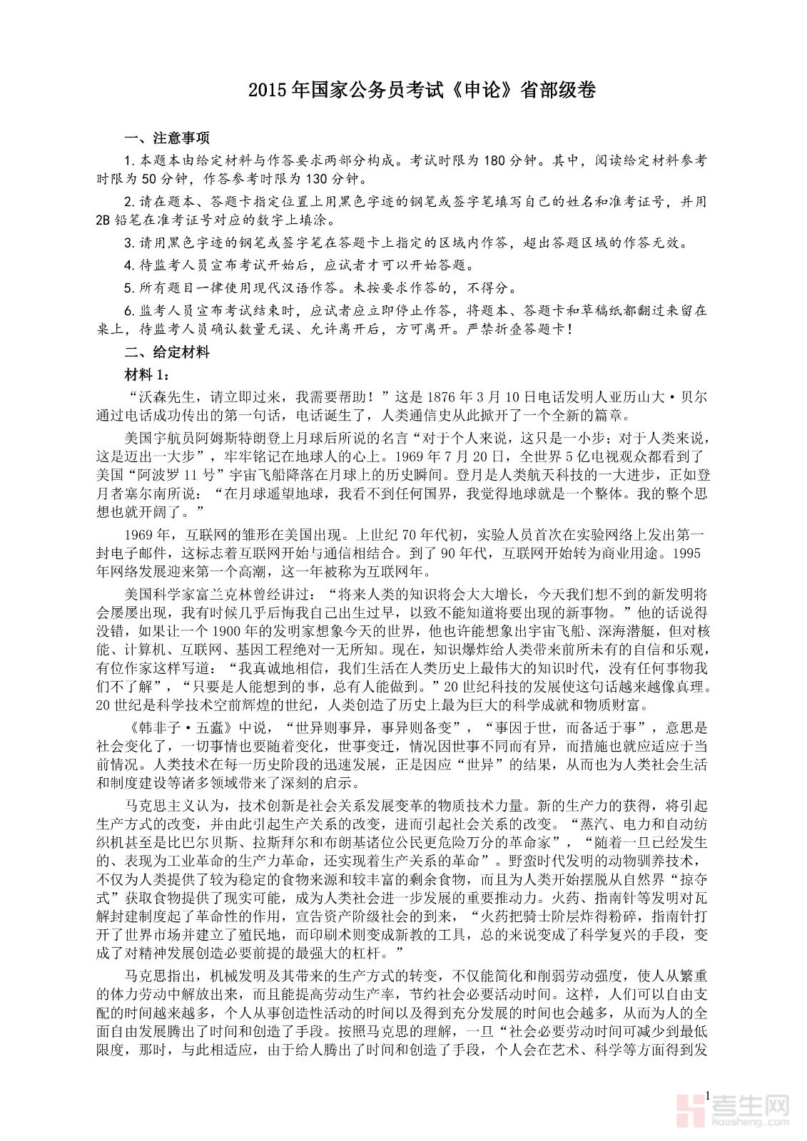 2015年国家录用公务员考试《申论》真题卷及答案(省部级)