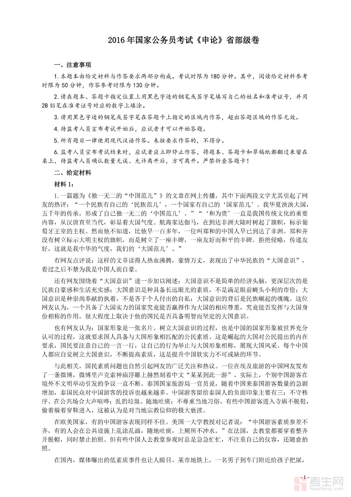2016年国家录用公务员考试《申论》真题卷及答案(副省级)
