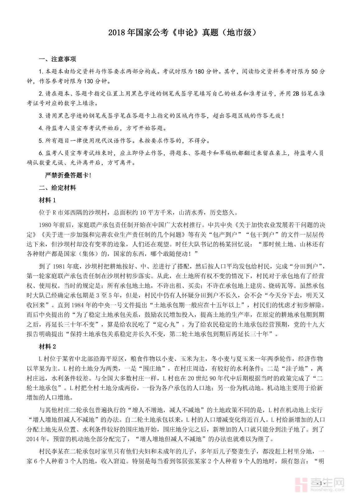 2018年国家录用公务员考试《申论》真题卷及答案(地市级)