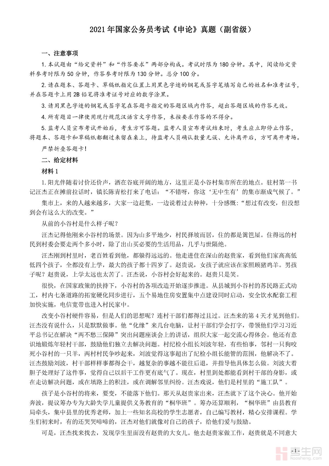 2021年国家公务员考试《申论》真题(副省级)及参考答案(两套答案)