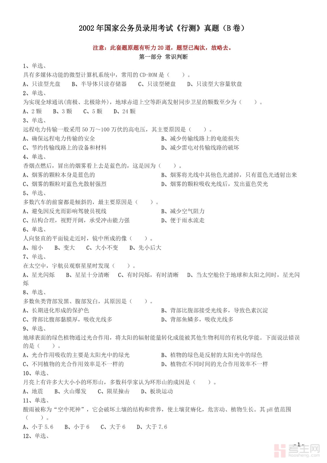 2002年国家公务员录用考试《行测》真题(B卷)