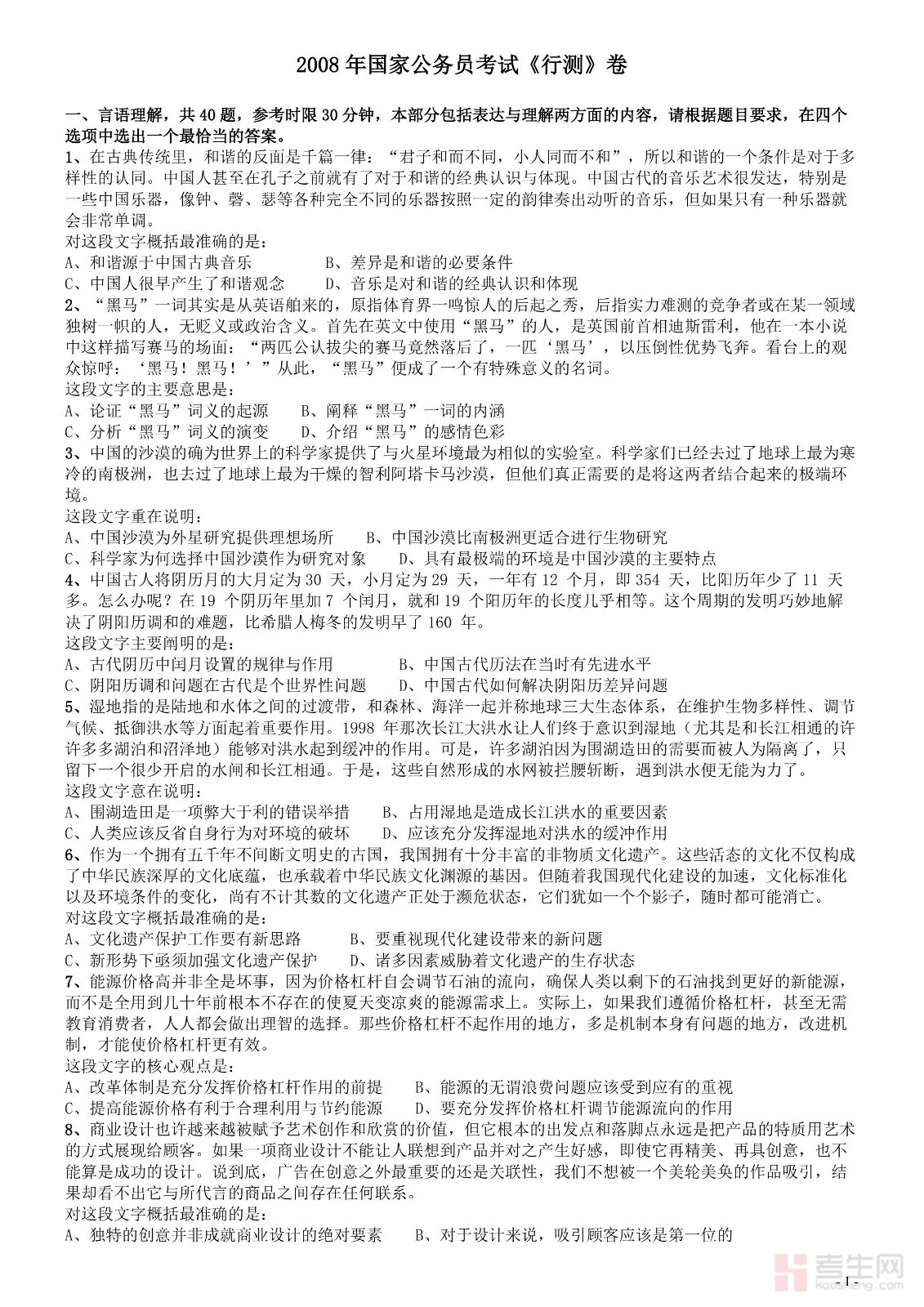 2008年国家公务员考试《行测》真题卷
