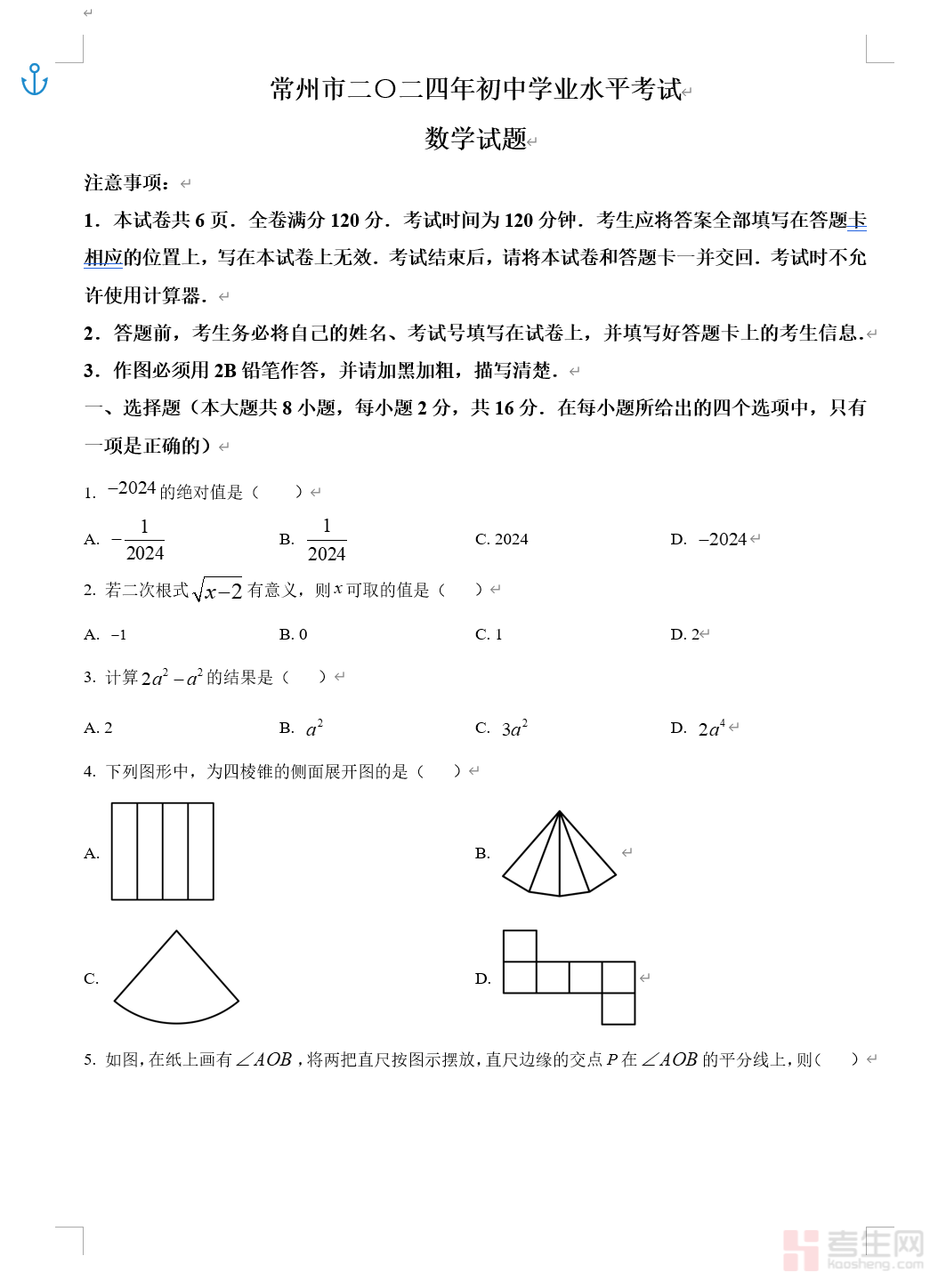 常州市二○二四年初中学业水平考试