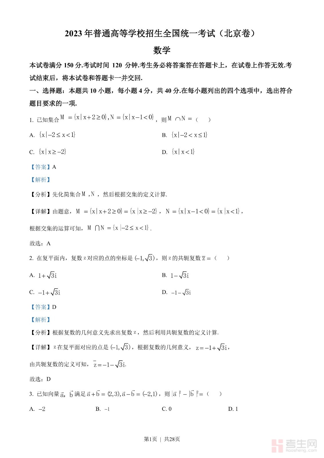 2023年高考数学试卷(新课标Ⅰ卷)(解析卷)
