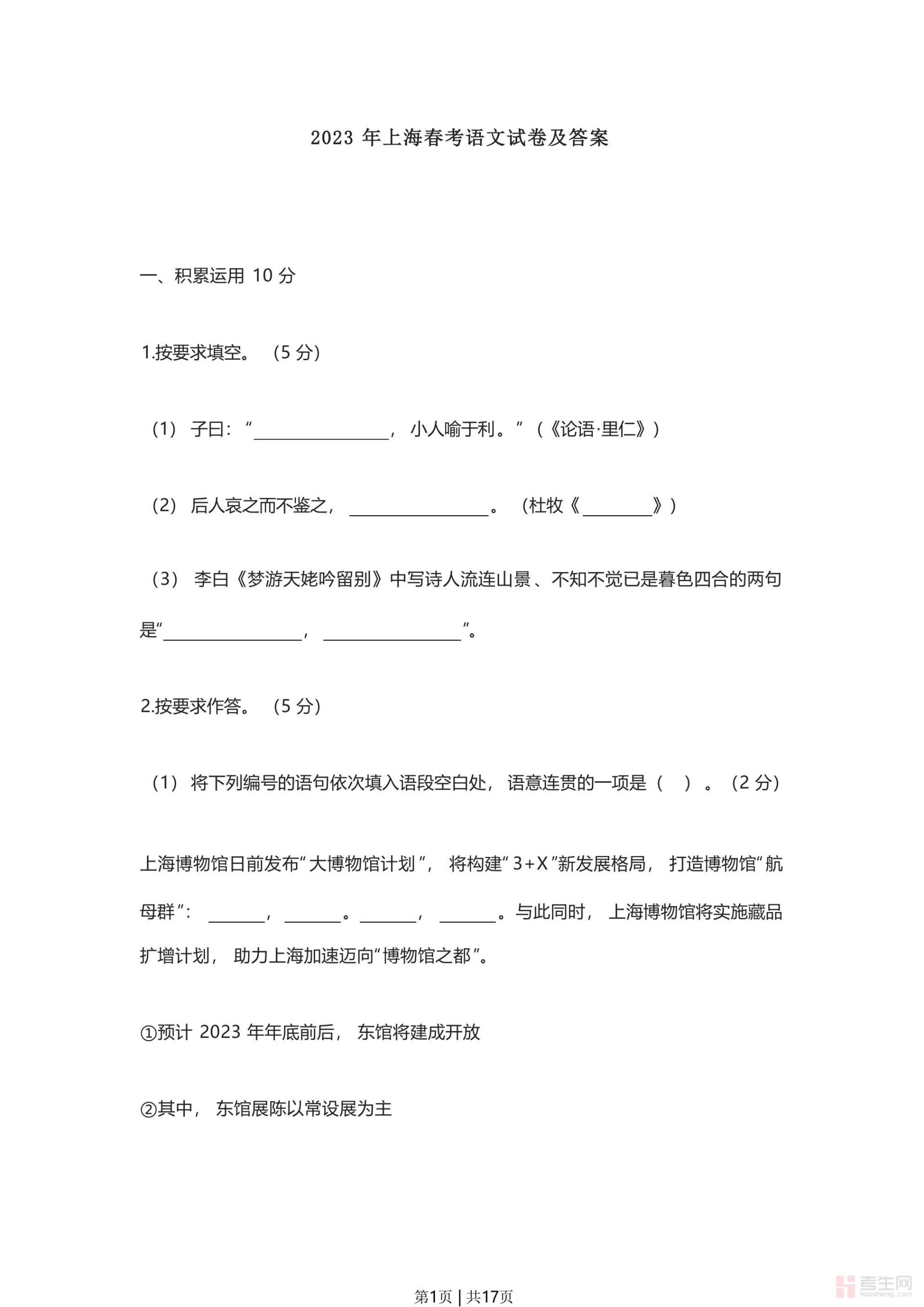 2023年高考语文试卷(上海)(春考)(空白卷)