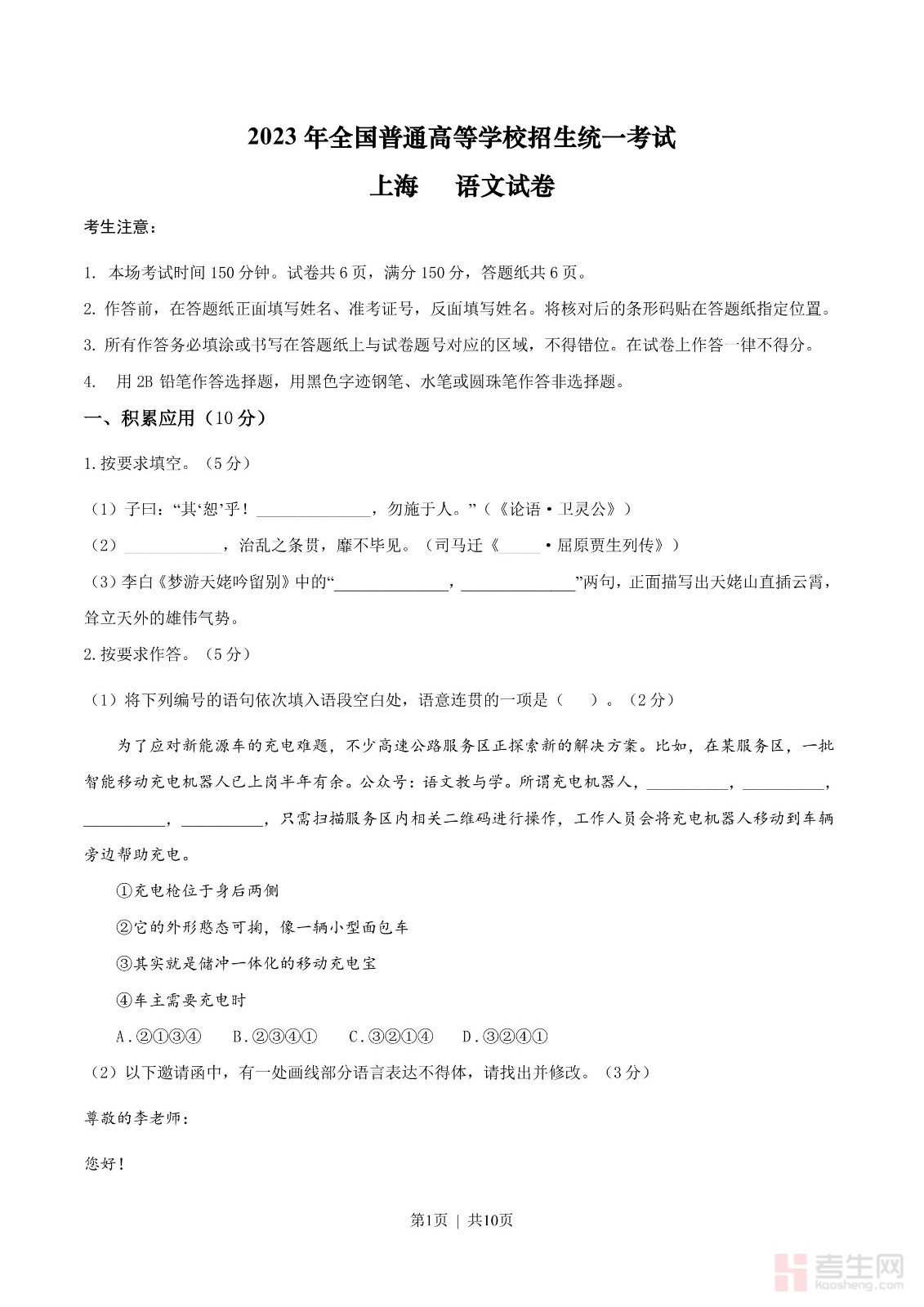 2023年高考语文试卷(上海)(春考)(解析卷)