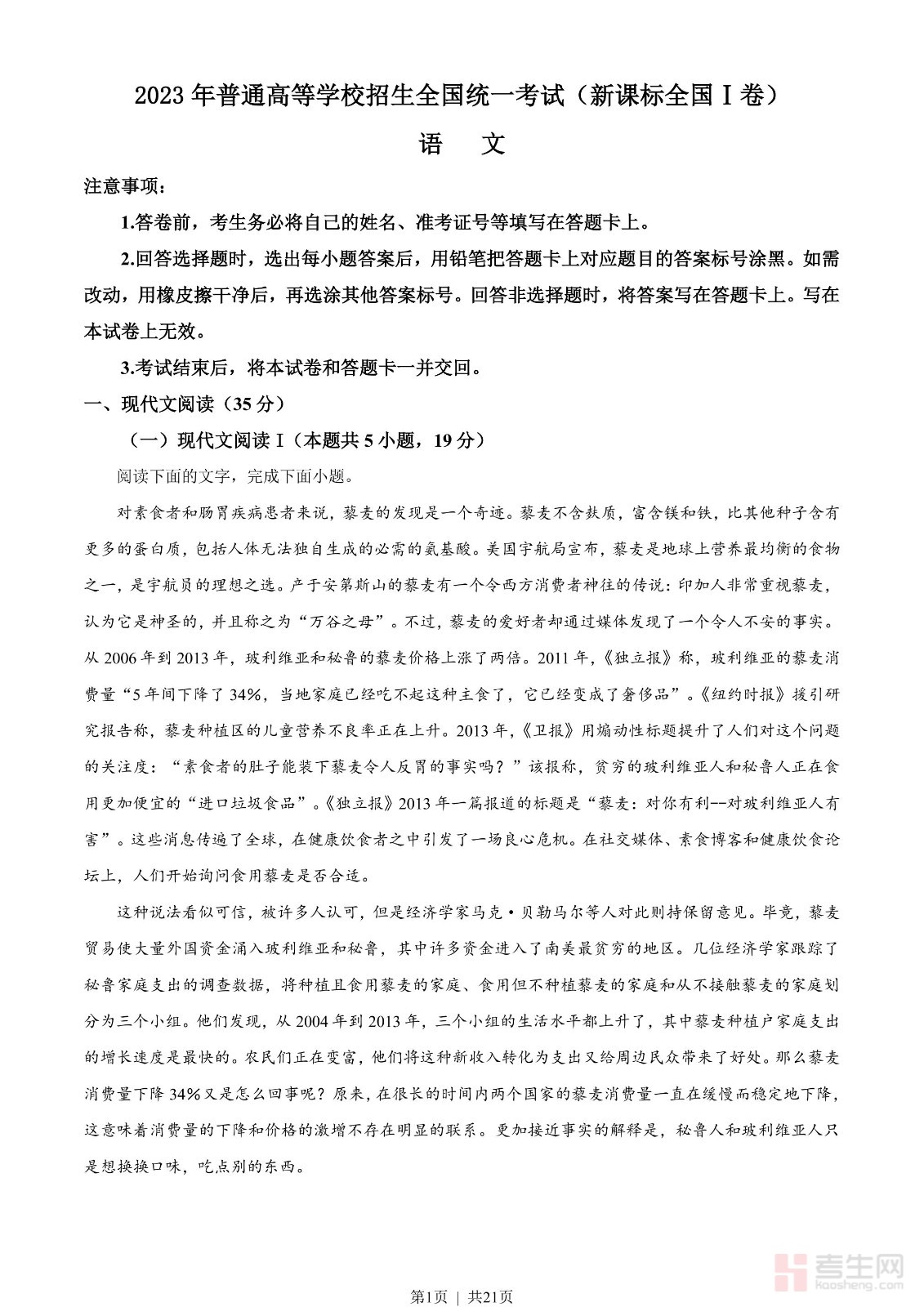 2023年高考语文试卷(新课标Ⅰ卷)(解析卷)