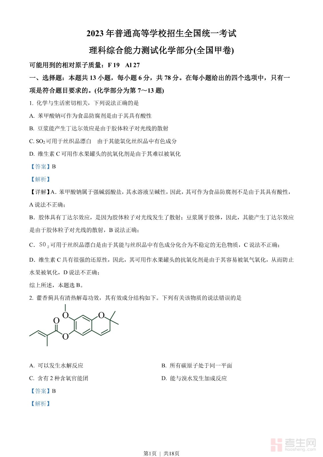 2023年高考化学试卷(全国甲卷)(解析卷)