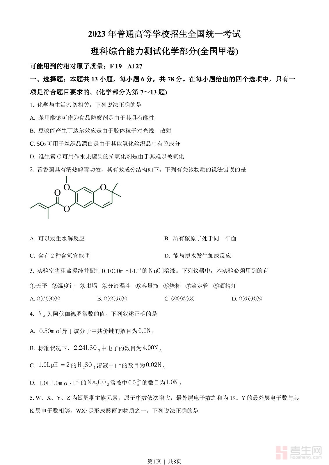 2023年高考化学试卷(全国甲卷)(空白卷)