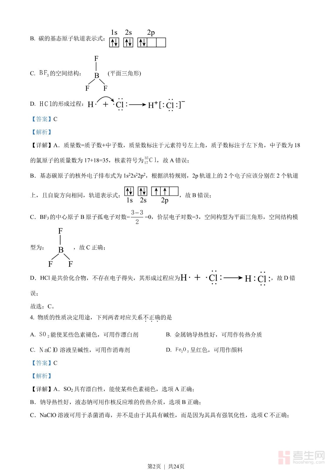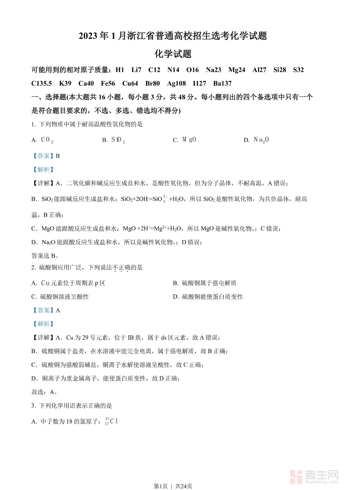 2023年高考化学试卷(浙江)【1月】(解析卷)