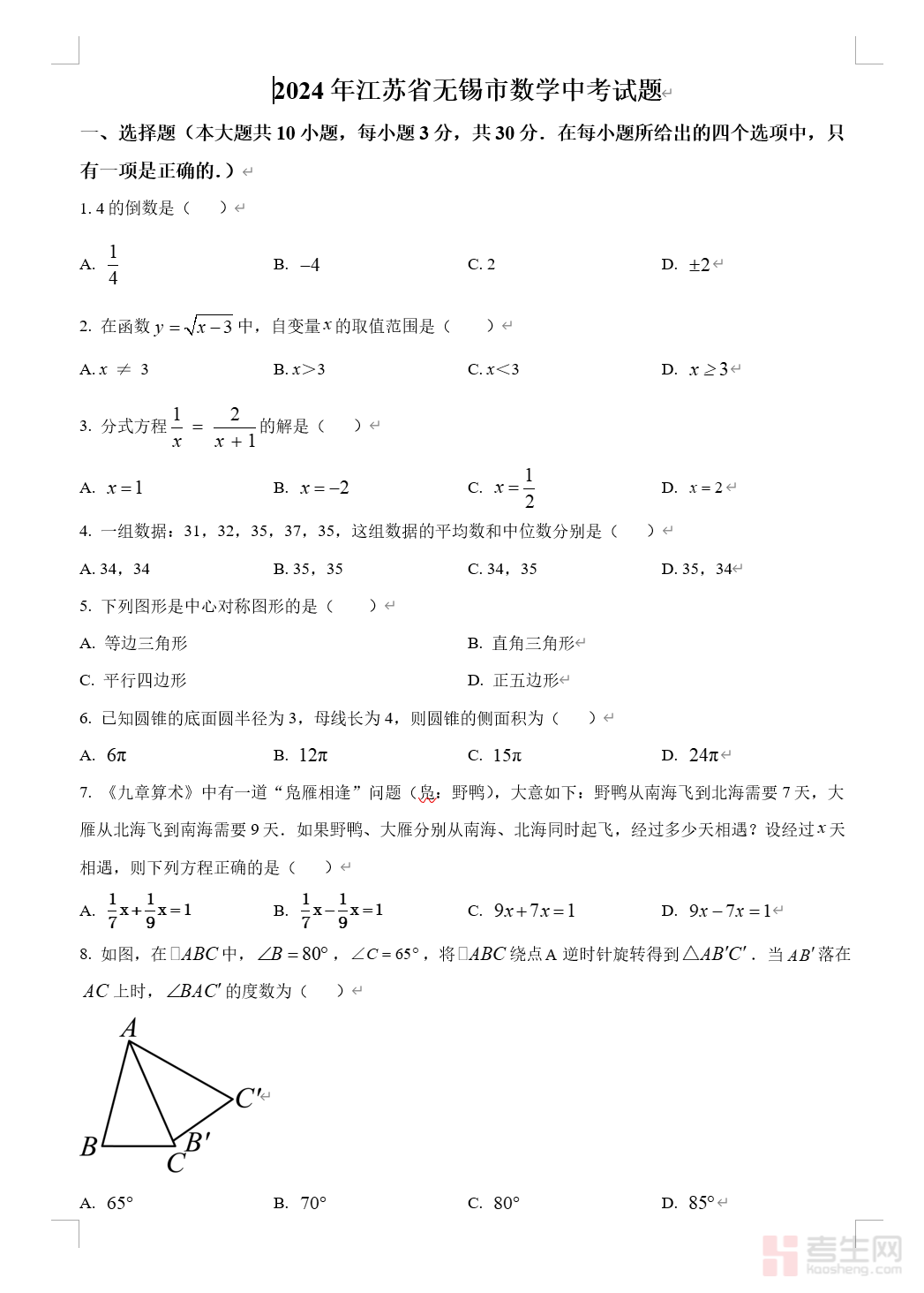 2024年江苏省无锡市数学中考真题试题(原卷版)