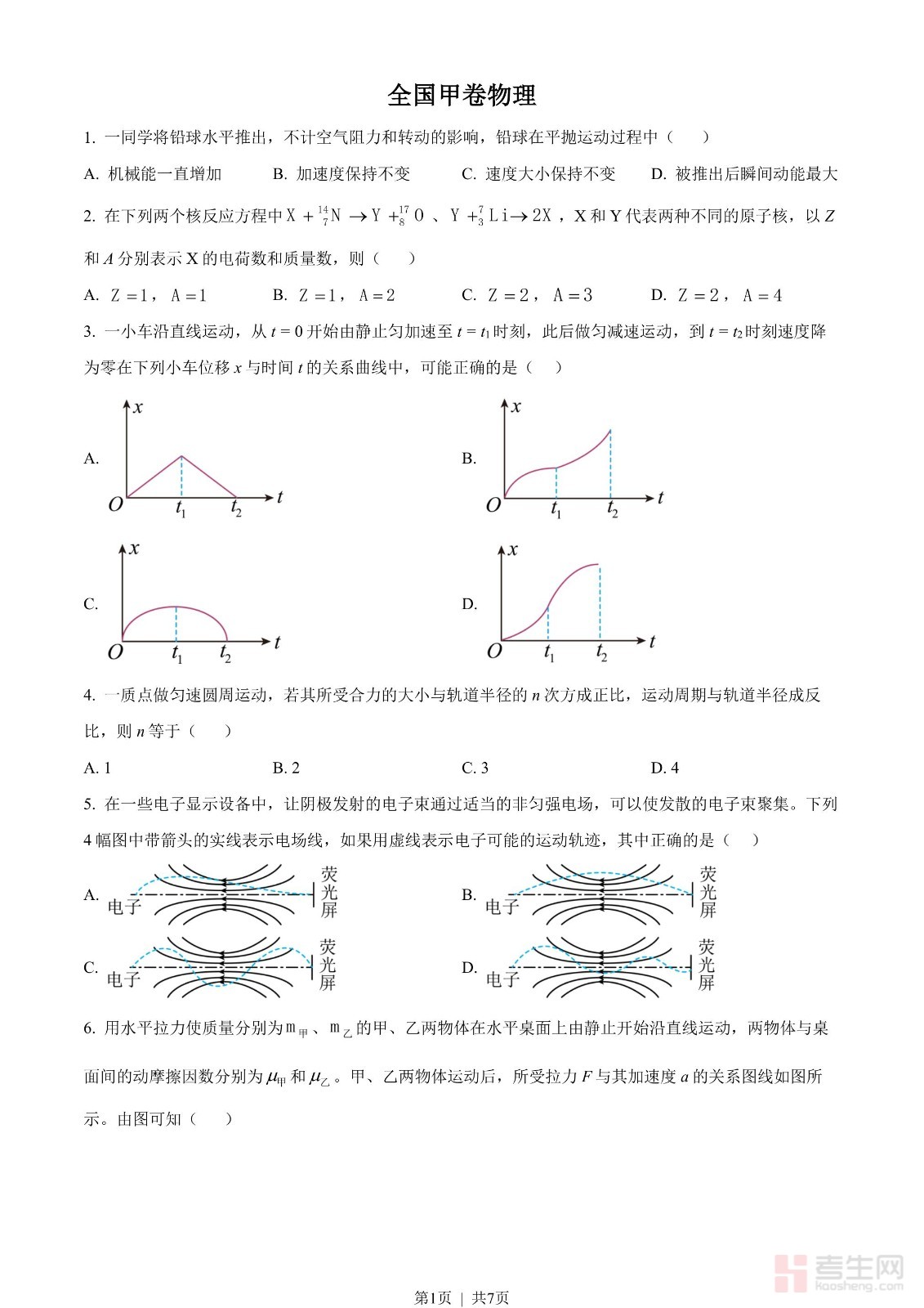 2023年高考物理试卷(全国甲卷)(空白卷)