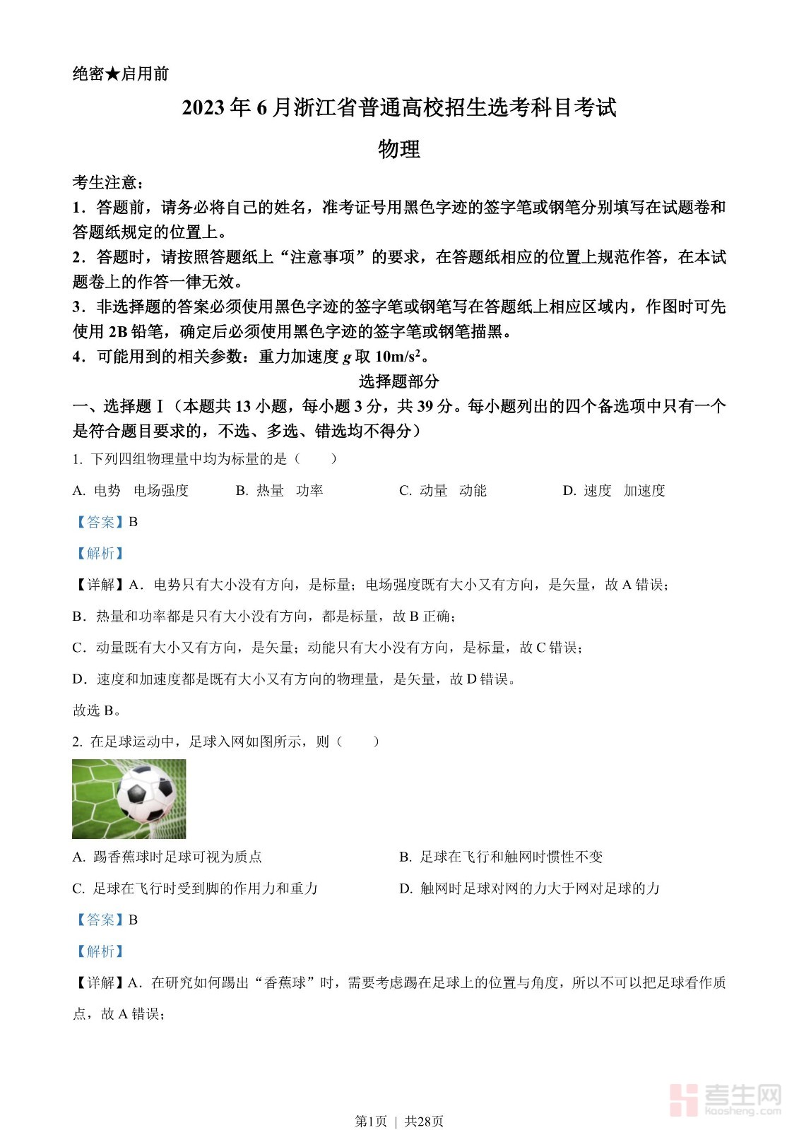 2023年高考物理试卷(浙江)【6月】(解析卷)