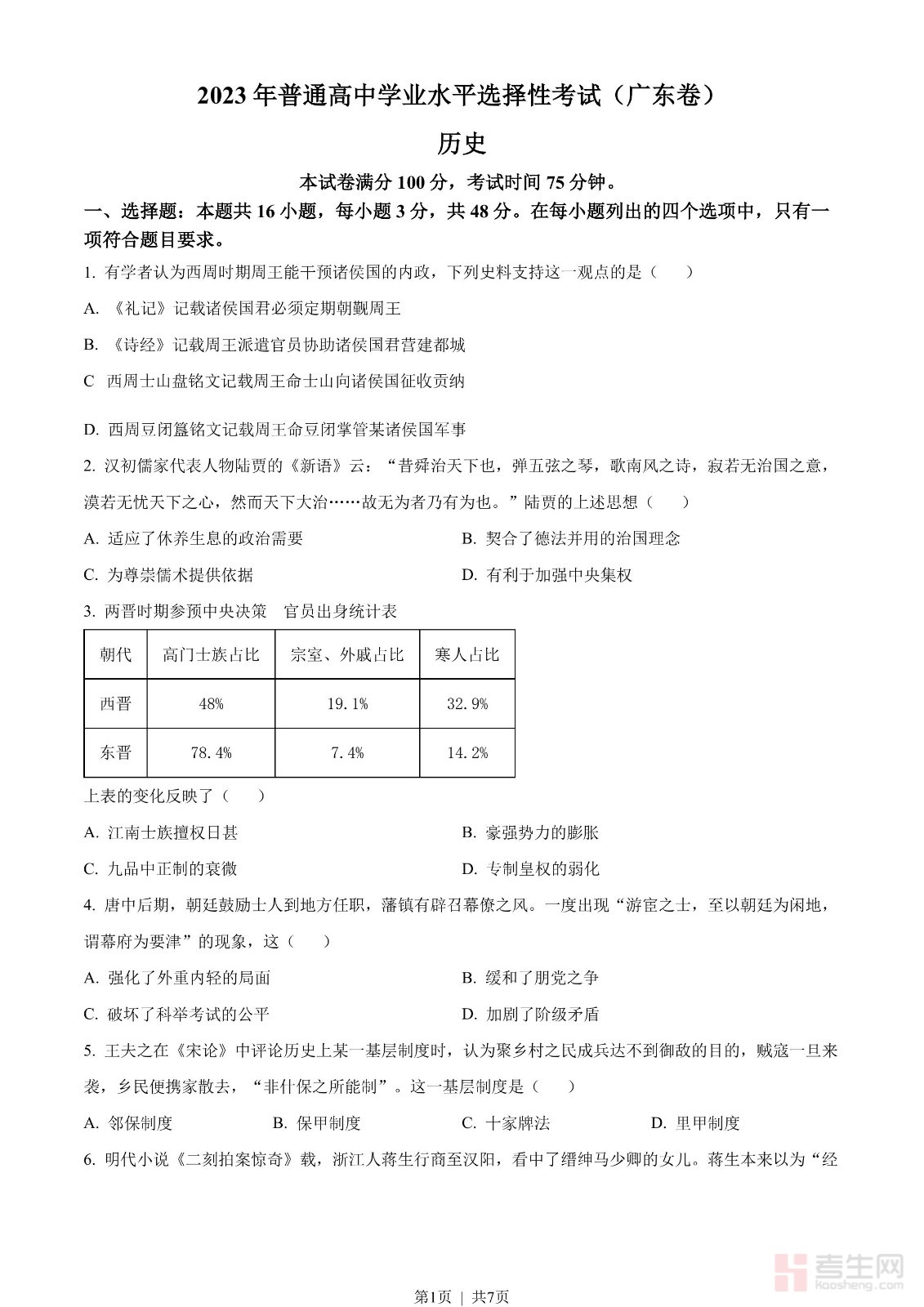 2023年高考历史试卷(全国甲卷)(解析卷)