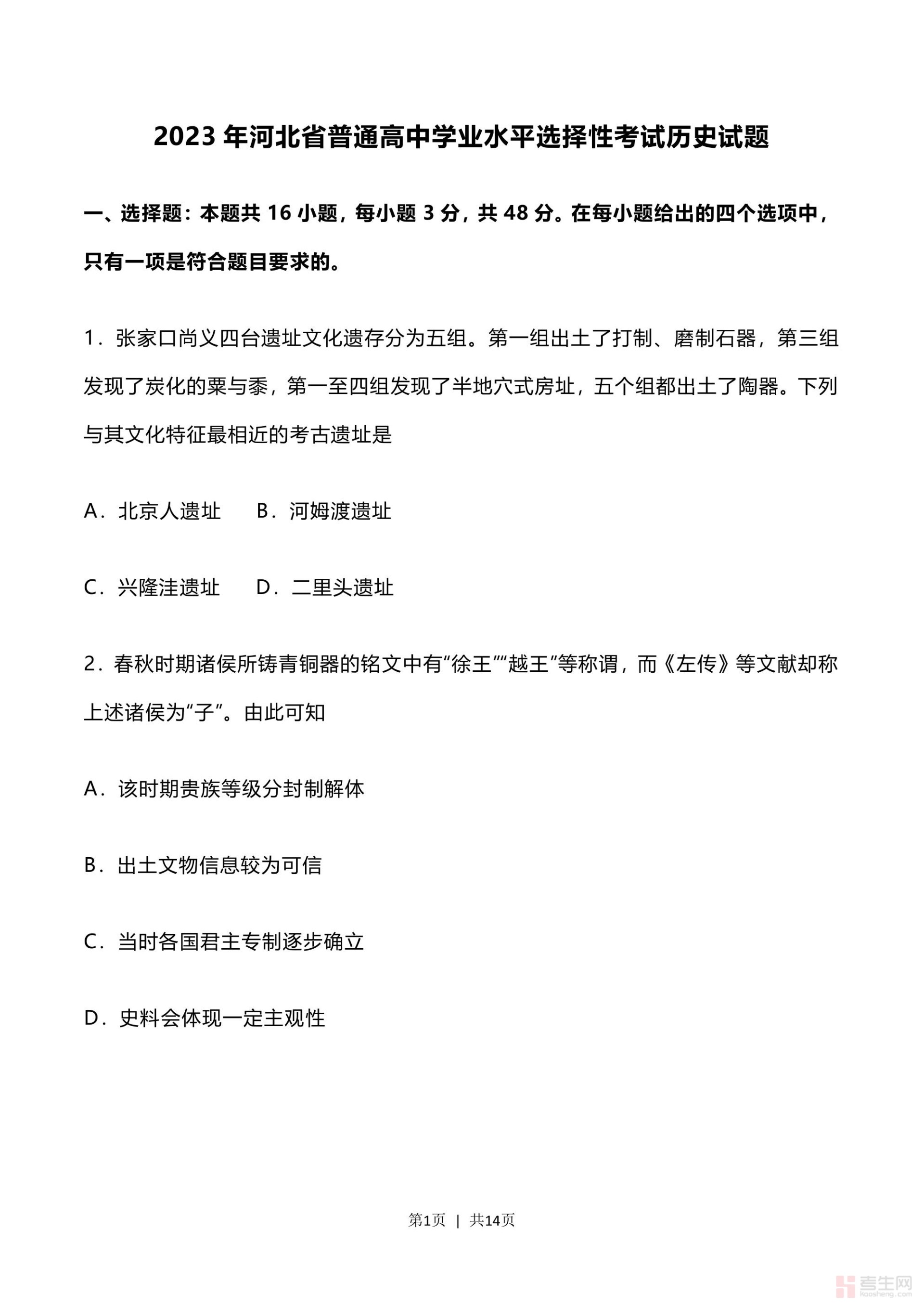 2023年高考历史试卷(浙江)(6月)(空白卷)