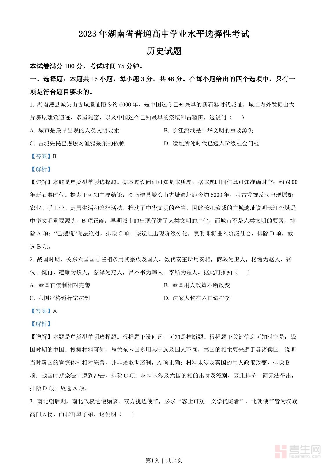 2023年高考历史试卷(湖南)(解析卷)