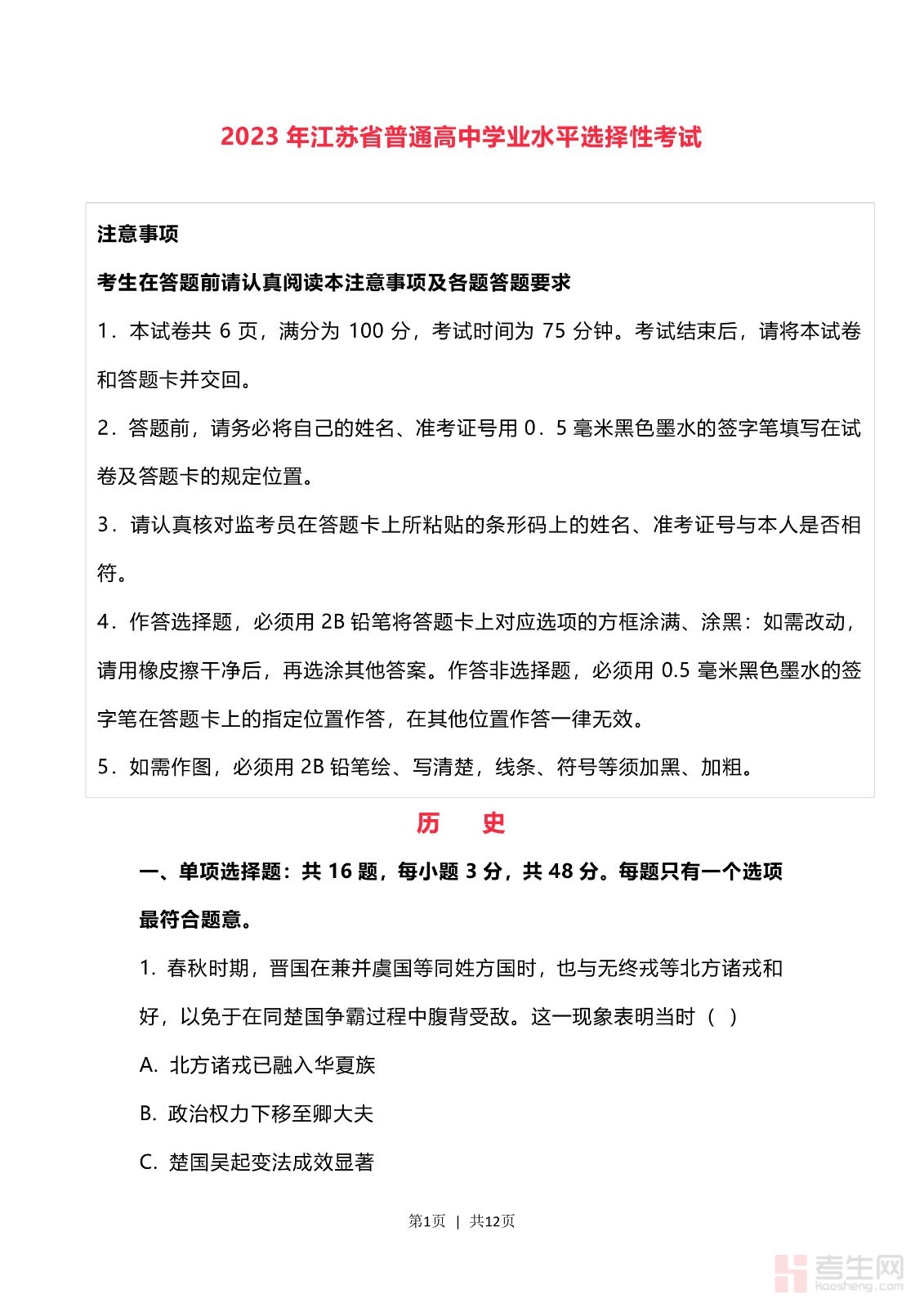 2023年高考历史试卷(江苏)(空白卷)