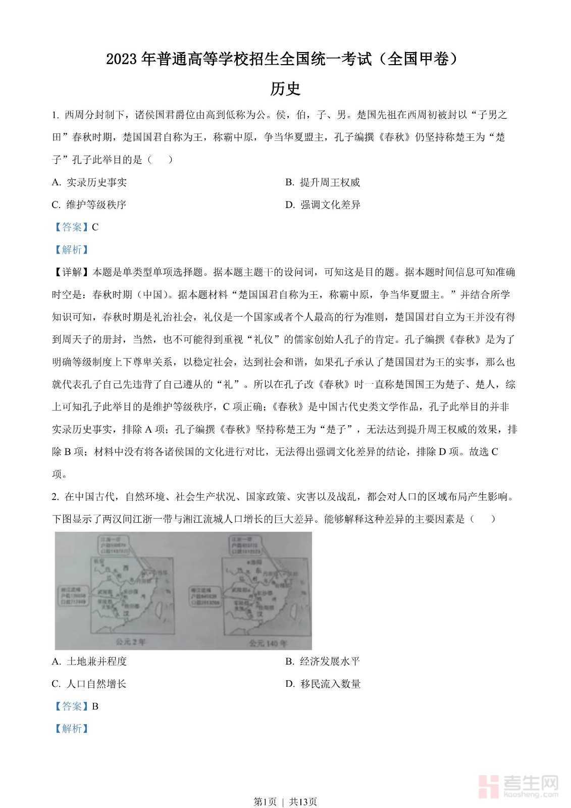2023年高考历史试卷(全国甲卷)(解析卷)