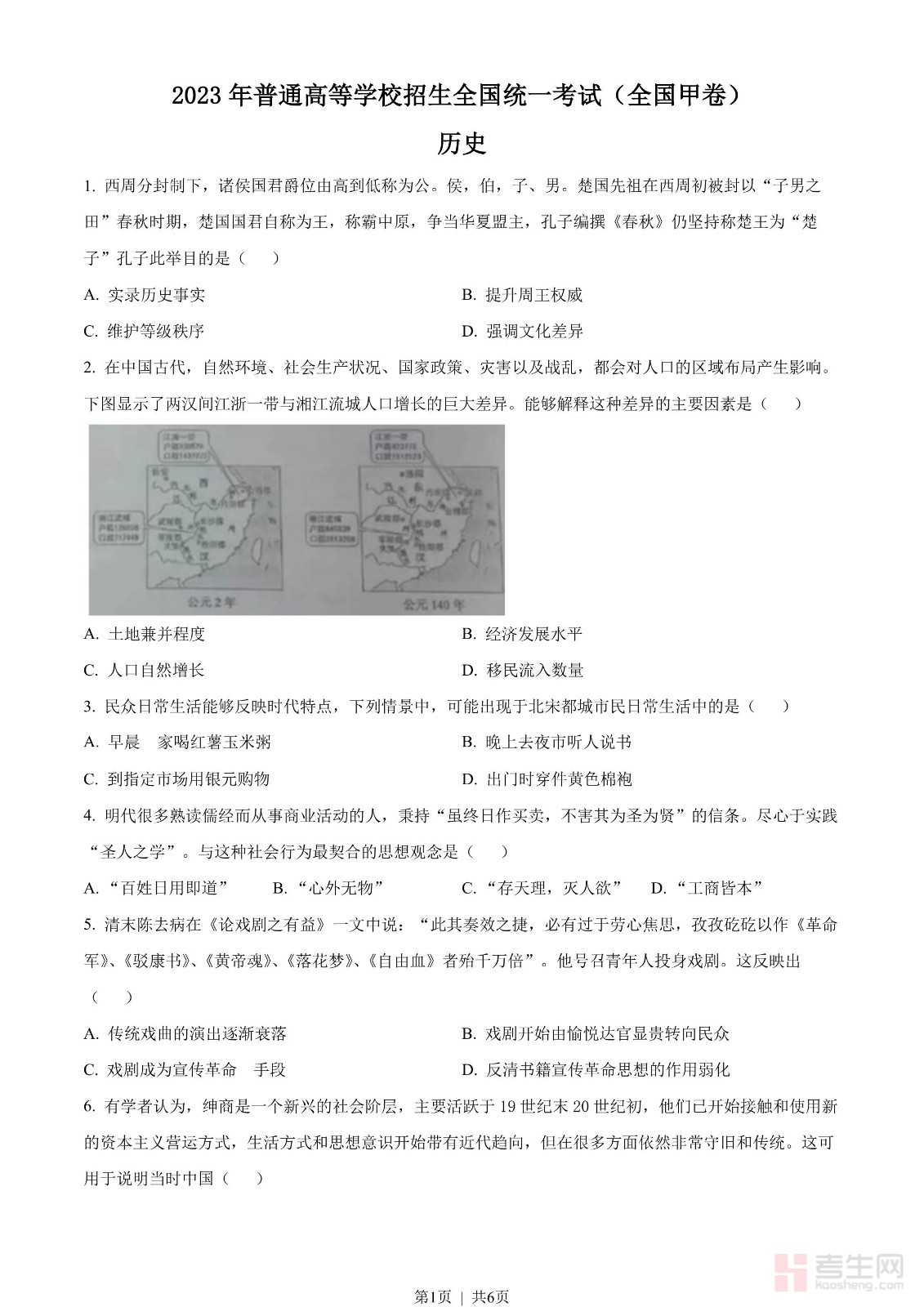 2023年高考历史试卷(全国甲卷)(空白卷)