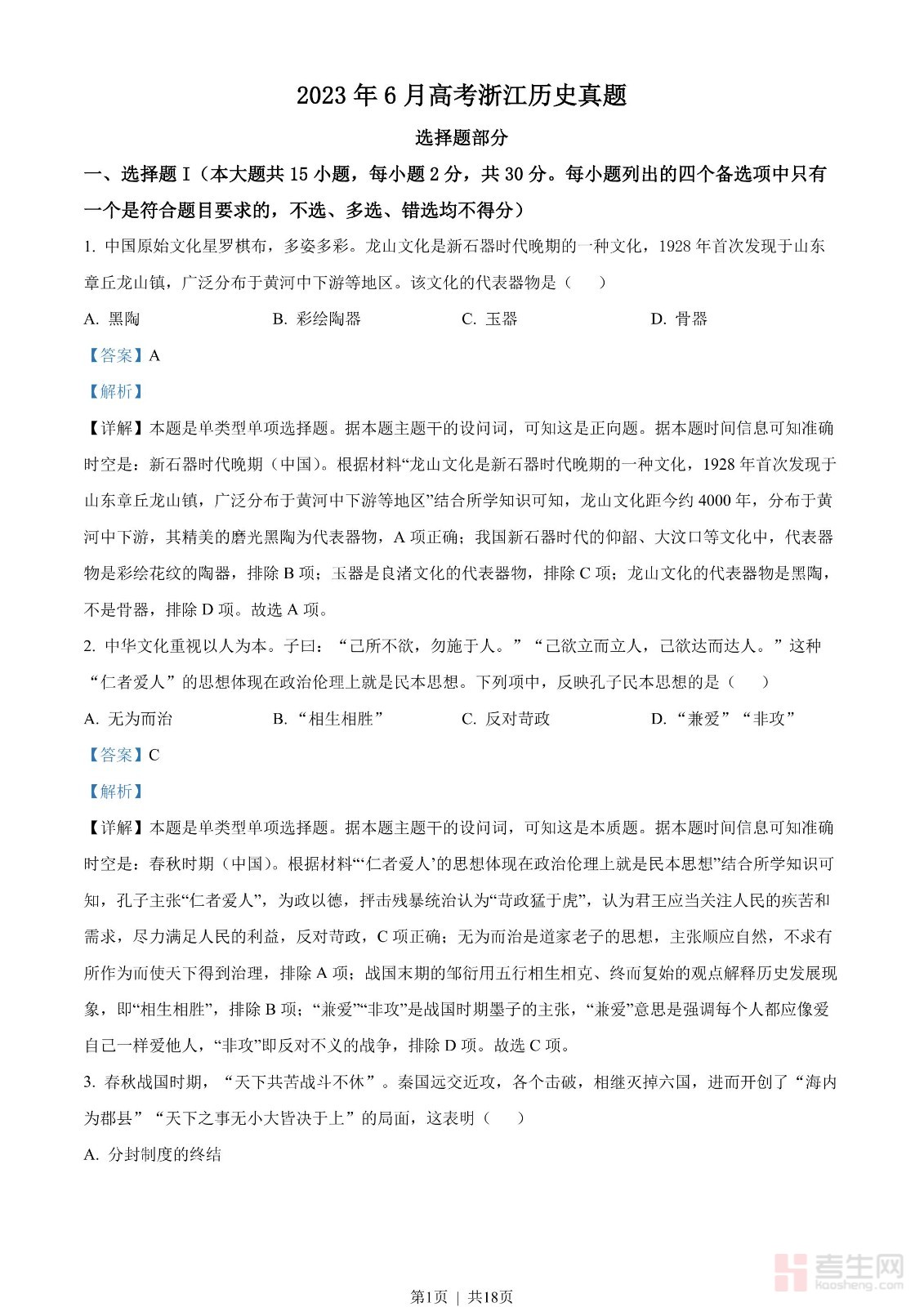 2023年高考历史试卷(浙江)(6月)(解析卷)