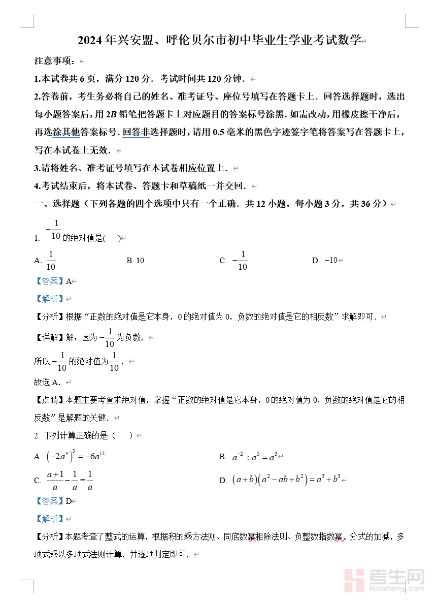 2024年内蒙古兴安盟、呼伦贝尔中考数学试题(解析版)