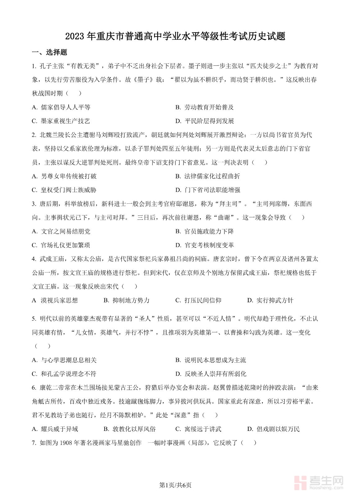2023年高考历史试卷(重庆)(空白卷)