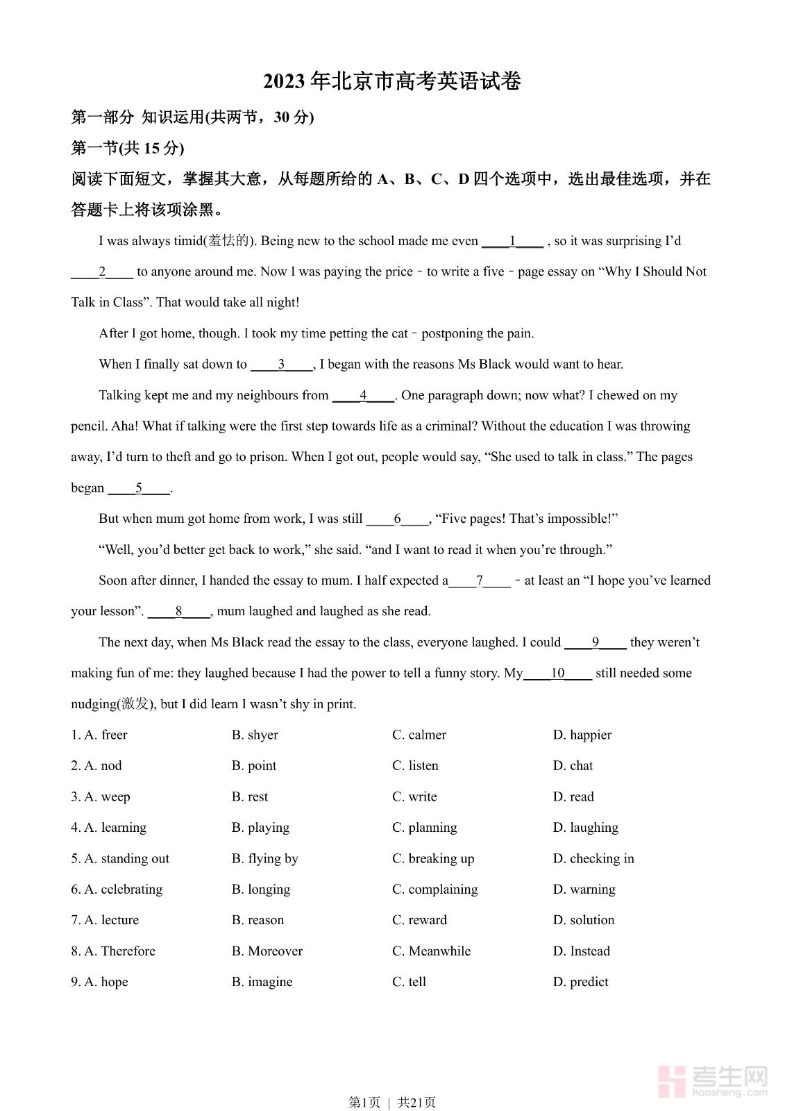 2023年高考英语试卷(北京)(机考 无听力)(解析卷)