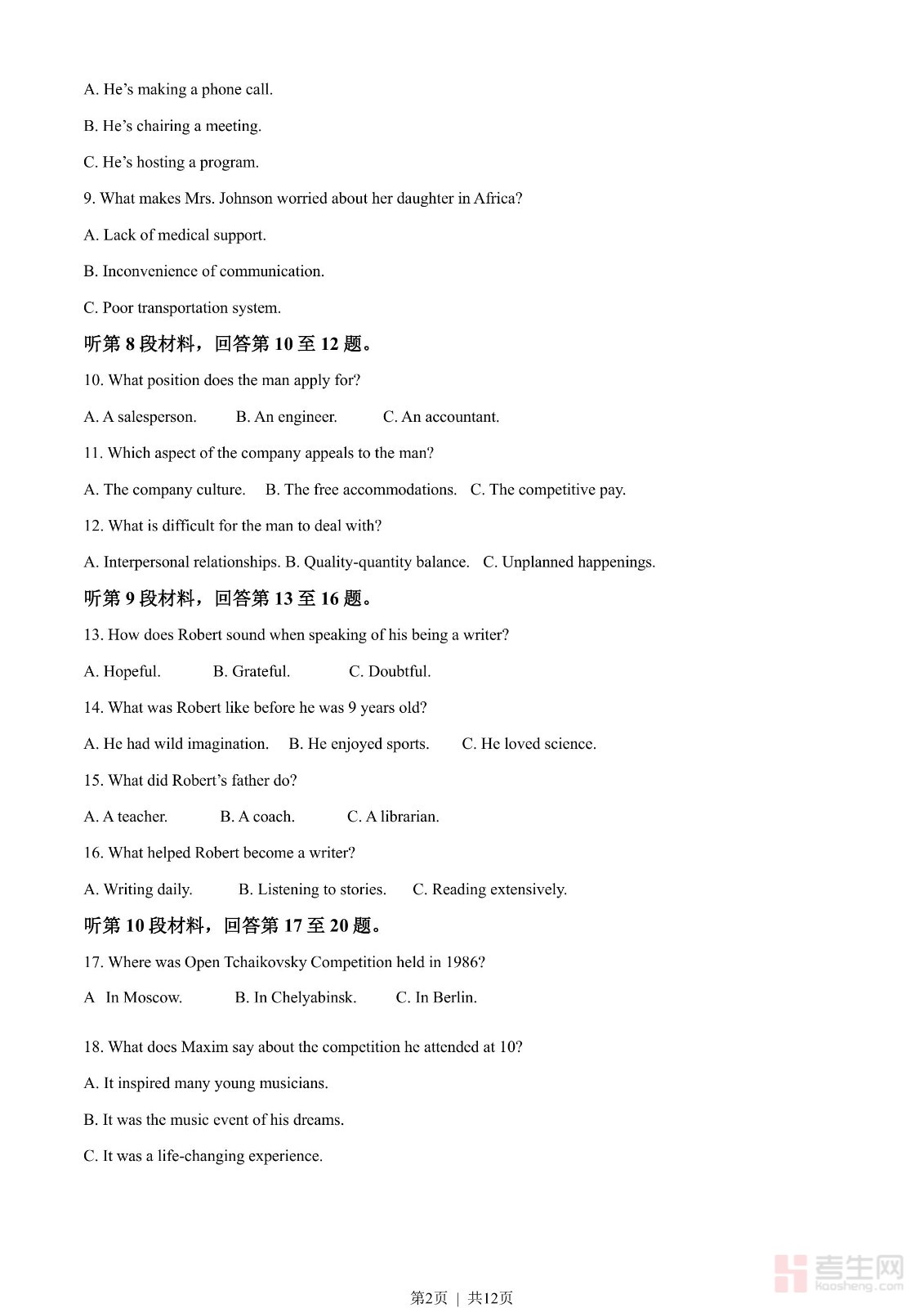 2023年高考英语试卷(上海)(春考)(空白卷)含听力音频