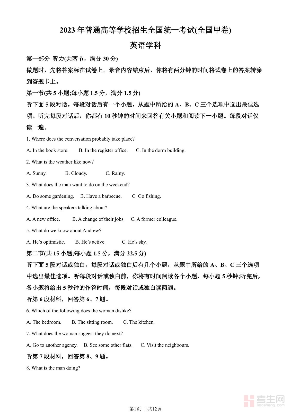 2023年高考英语试卷(全国甲卷)(空白卷)含听力音频.