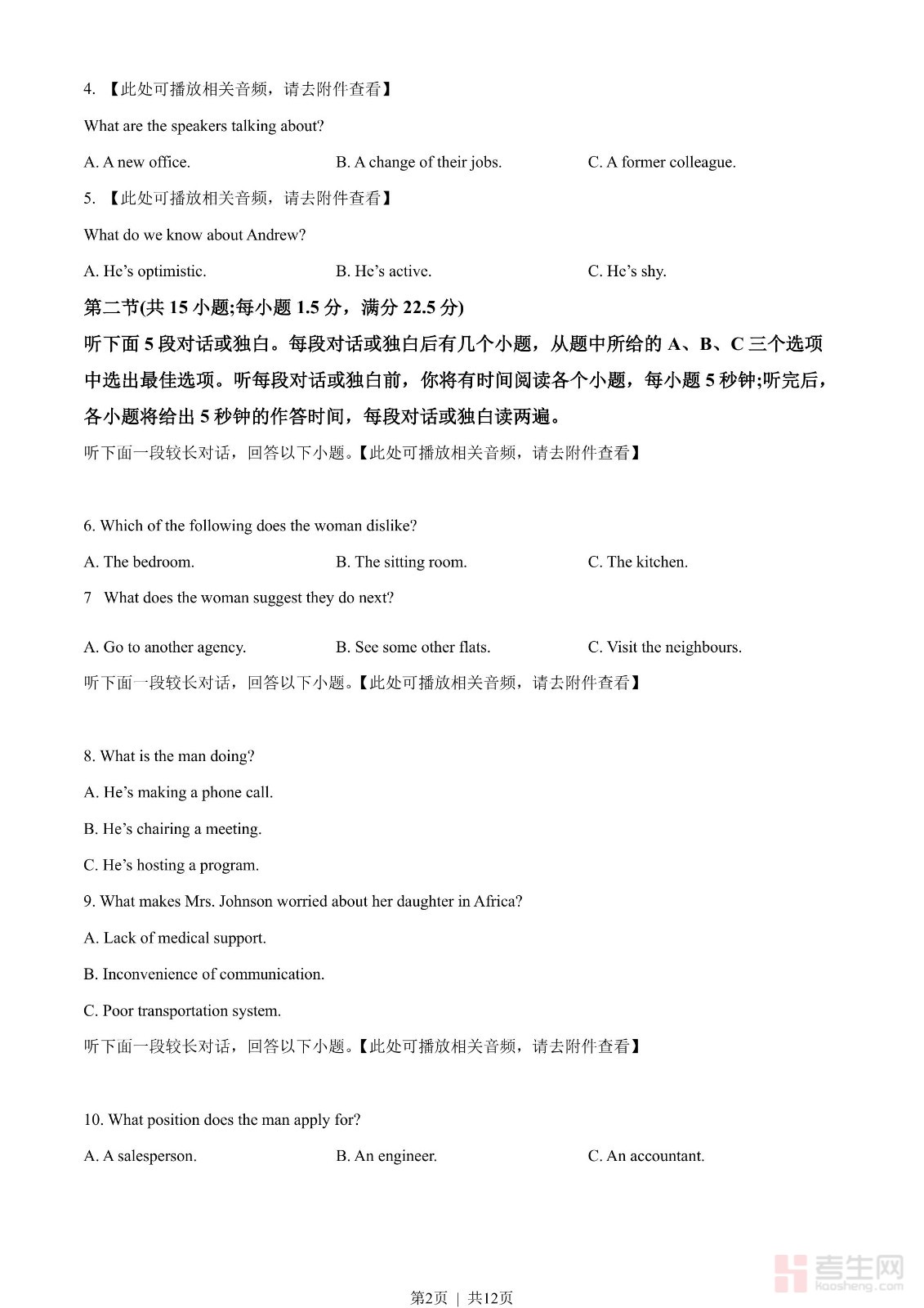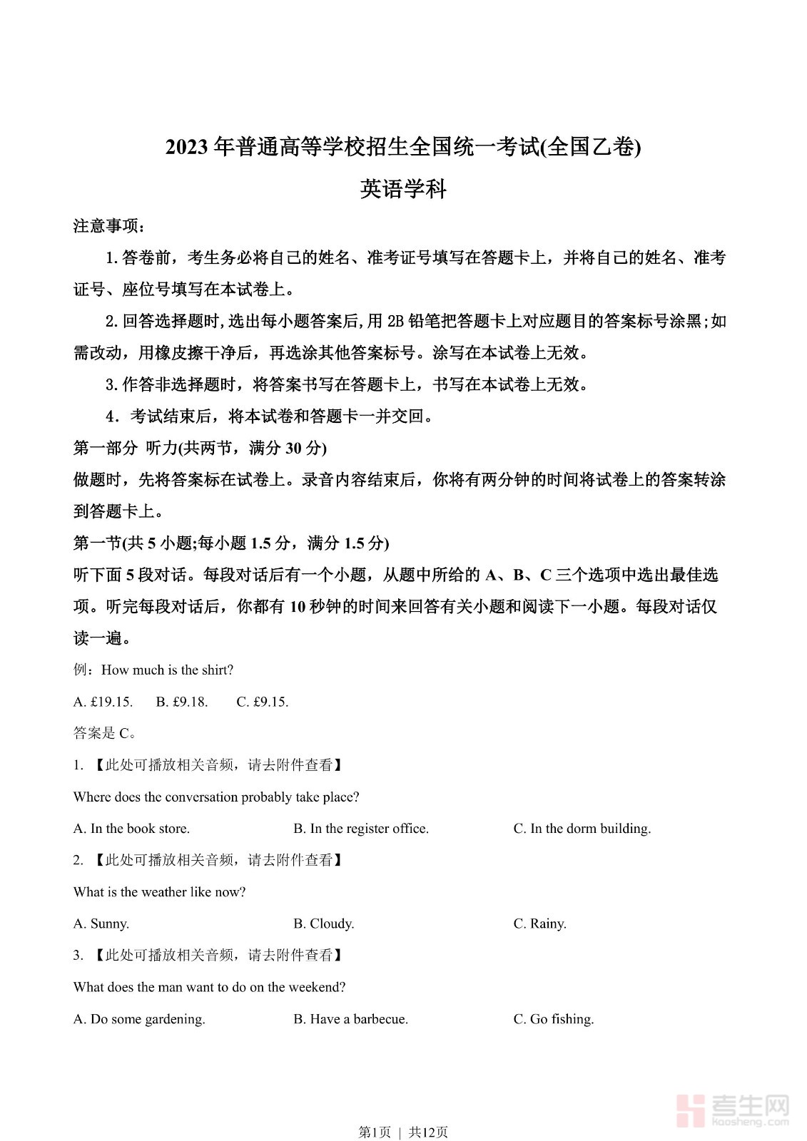 2023年高考英语试卷(全国乙卷)(空白卷)含听力音频