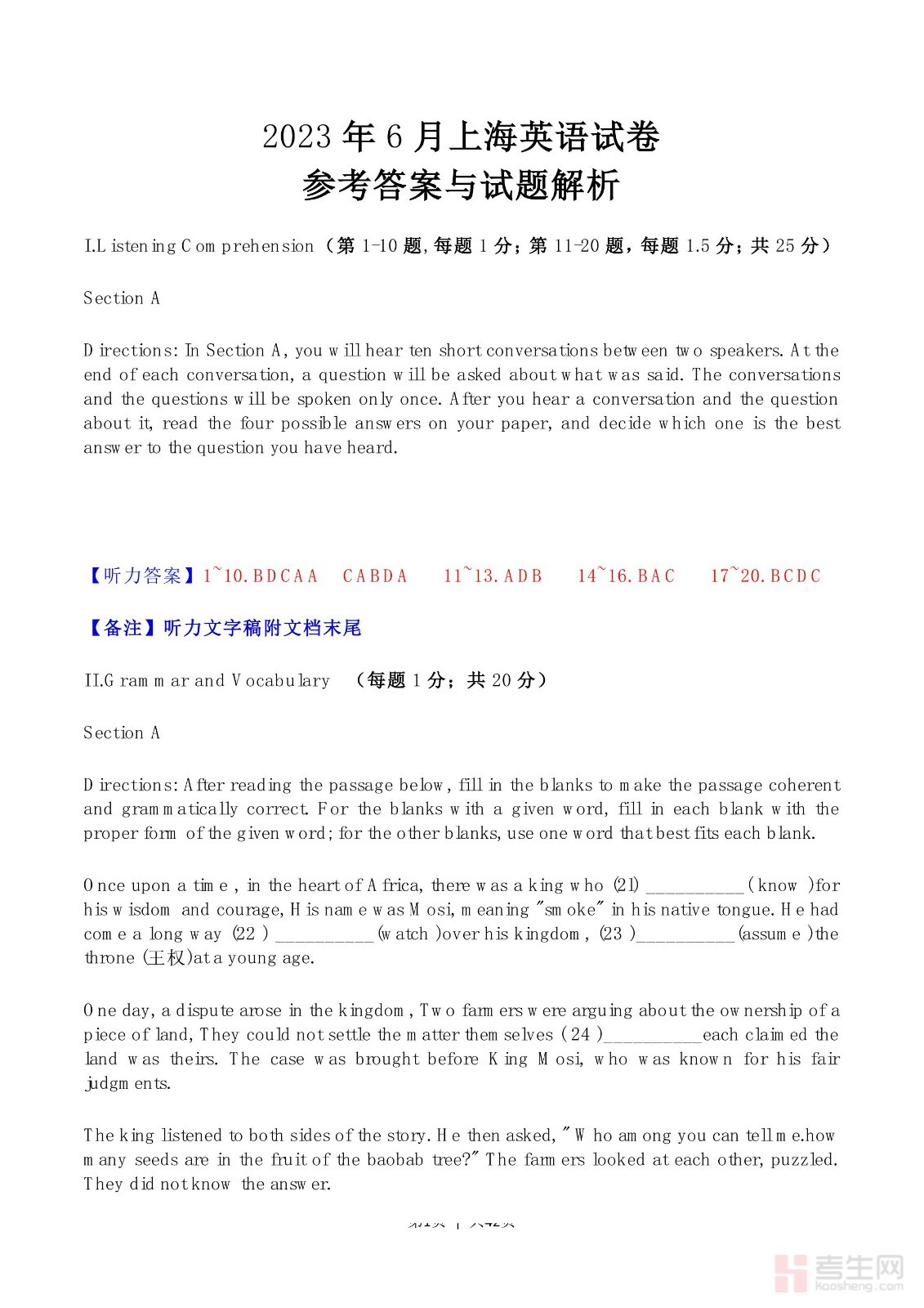 2023年高考英语试卷(上海)(春考)(解析卷)