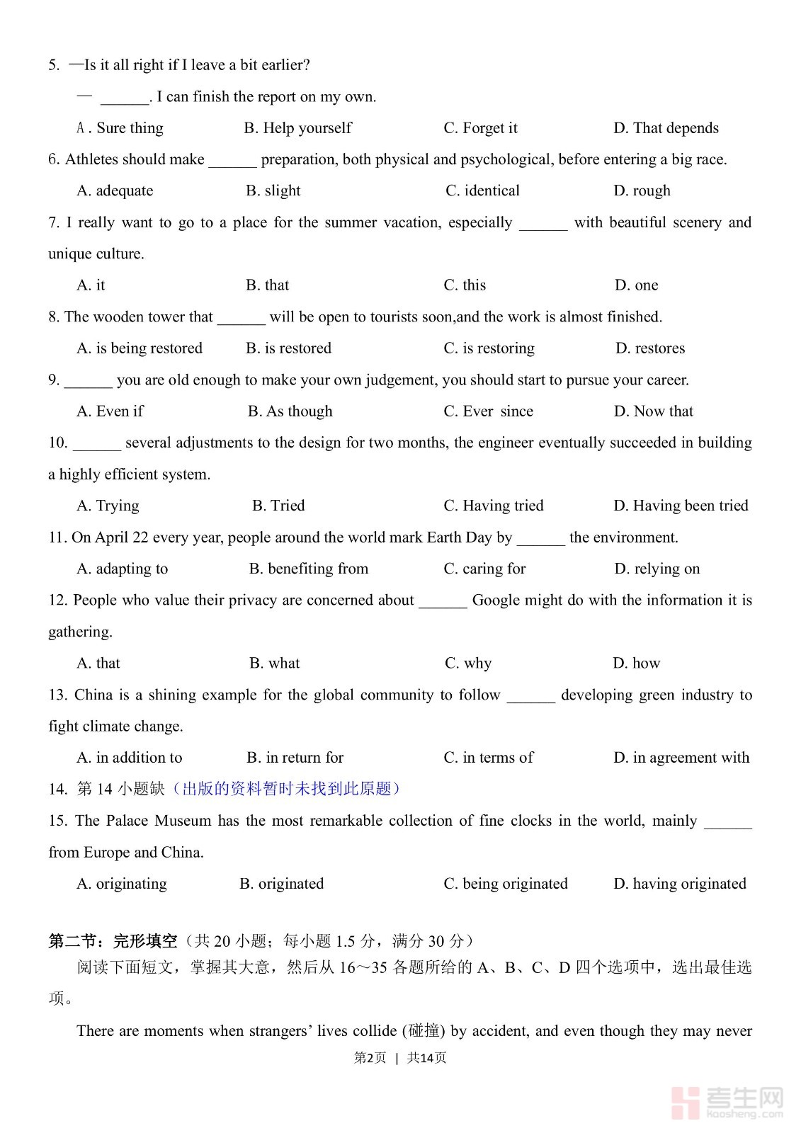 2023年高考英语试卷(上海)(春考)(解析卷)