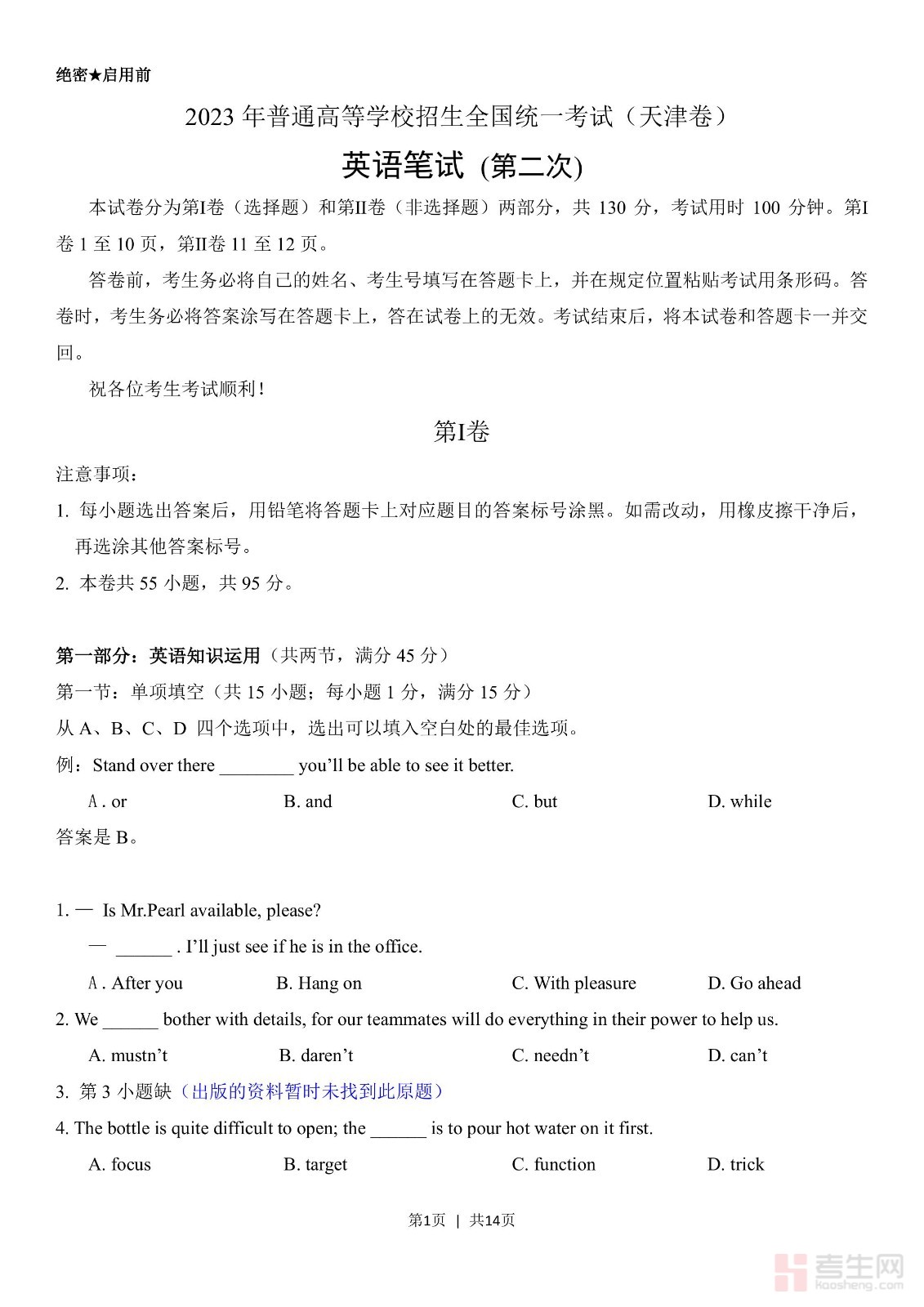 2023年高考英语试卷(天津)(第一次)(答案卷)
