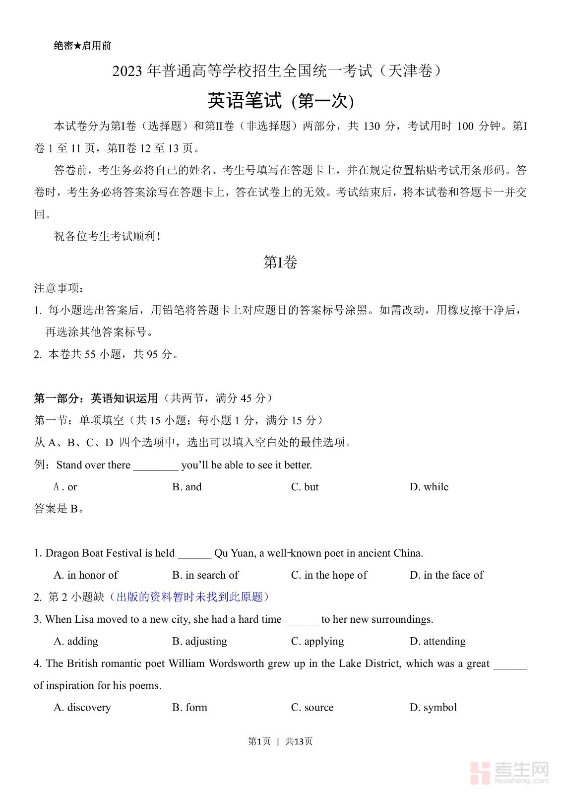 2023年高考英语试卷(天津)(第一次)(答案卷)